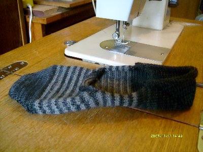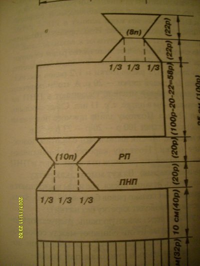 madamka, носочки на одной фантуре будут со швом внутри ножки, но это их совсем не портит. На фото -схема. Описание носков на одной фантуре: Р-Р 36-37, 4нити 32/2, плот.6. Набрать на вспомогательную нить 36-0-36 петель, провязать 14-16 рядов и сделать разбор на ложную резинку: 2 иглы в работе, следующ. петлю перенести на соседнюю и иглу из работы убрать, задвинуть в ЗНП( заднее нерабочее положение), и т.д. , получится ложная резинка 2/1, связать 60 рядов, и сделать подгиб, подвесив открытые петли 1-го ряда на работающие иглы. Когда сделали подгиб введите все иглы в работу, провязать 20 рядов и начать пятку на половине игл.Каретка слева,выдвиньте правую половину игл в ПНП(иглы не вяжут при ЧВ). Включить рычаги ЧВ.Петли пятки условно поделить на 3 части.Вязать ЧВ(частичным вязанием), как в подследниках.Когда пятка связана, введите все иглы в рабочее положение(РП), ивяжите следок 50 рядов.Теперь приступаем к мыску, он вяжется с противоположной стороны пятки.Поэтому каретка справа, а левую половину рабочих игл выдвигаем в ПНП. Включаем рычаги ЧВ.Вяжем мысик,как пятку. Чтоб закончить вязание, все иглы введите в РП и провяжите несколько рядов вспомогательной нитью. Снимите вязание с машины. Второй носок вяжите в зеркальном отражении.Полотно с бросовой нитью отпарить, аккуратно распустить бросовую нить, а открытые петли сшивают между собой горизонтальным трикотажным швом. А по всей длине носок сшивают вертикальным трикотажным швом. Не пугайтесь длинного описания, свяжите, разберитесь, и увидите, что это не так и долго. Удачи! Прилагаю схемку, чтоб было понятно, где пятка, где носок.
