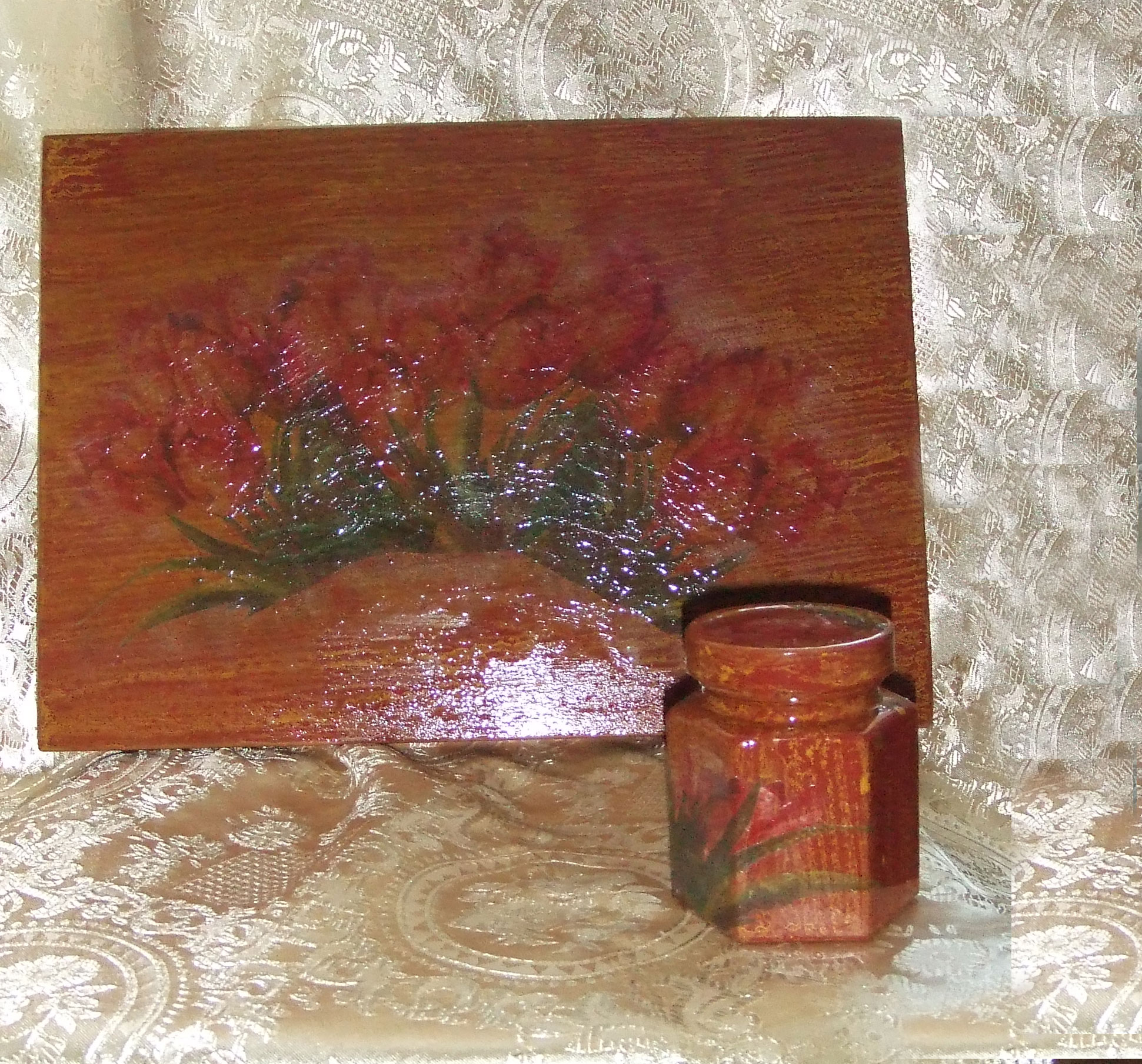 Я зашкурила досточку. Потом покрыла ее в два слоя коричневой акриловой краской. Через 2 часа нанесла лак для кракелюра. Когда он немного подсох, нанесла желтую акриловую краску. После того, как она высохла, приклеила мотив (клеила ПВА ½ с водой).