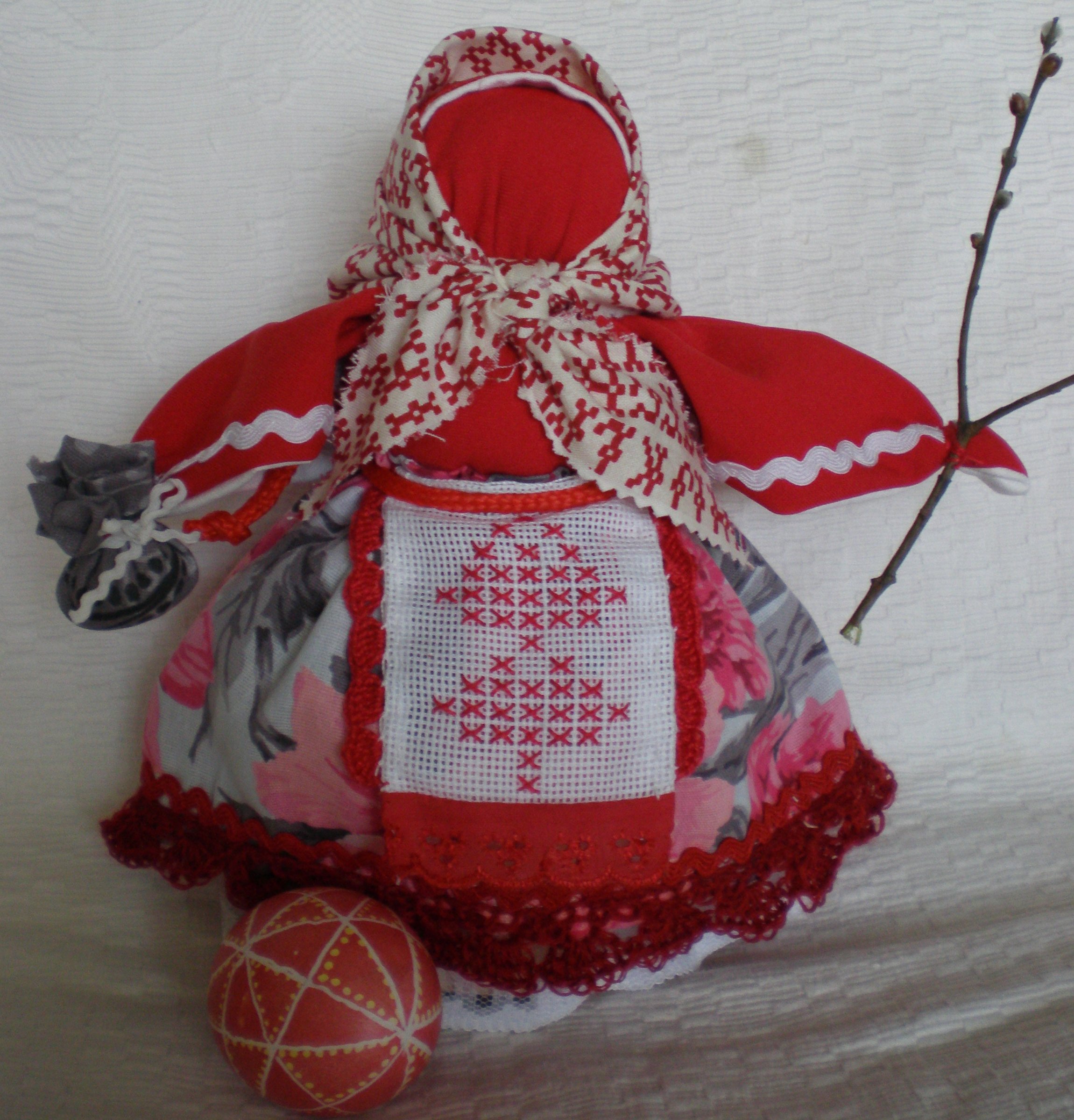 Пасхальная кукла символизирует женщину, которая идет на Пасху к церкви освящать пасхальный кулич. Выполняется кукла в красных цветах. Лицо такой куколки обязательно должно быть красное. На лице также можно выплести тоненький желтый, или золотистый крестик. В ручках куколка обычно держит узелок, который символизирует котомку с куличами, а можно вложить яйцо.