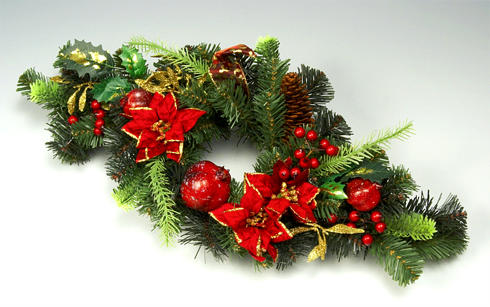 - Интересно выглядит новогодняя композиция в виде короткой гирлянды, зрительно она увеличивает высоту комнаты. Укрепить ее можно на куске коры любого дерева. Делают ее так: толстую проволоку обматывают любой тканью, а затем, начиная сверху, плетут на этом каркасе гирлянду из коротких хвойных веточек, располагая их рядами. Каждый ряд обкручивают тонкой проволокой, располагая последующий ряд так, чтобы он закрывал концы предыдущего. Одновременно вплетают шишки, игрушки, сухоцветы, конфеты, банты из лент, маленькие плоды.