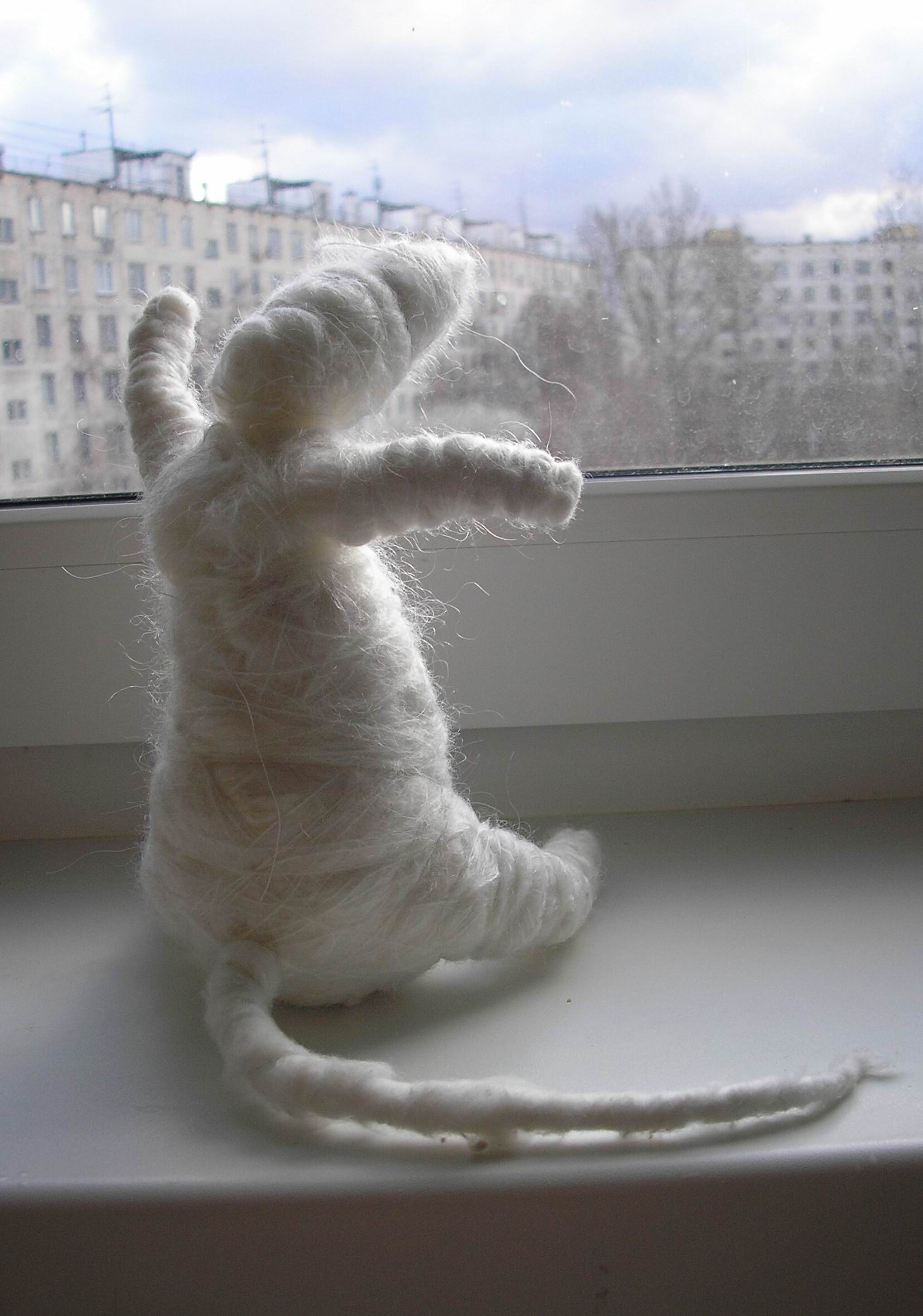 У меня даже проволоки нет. Я взяла туалетную бумагу, намотала на руку потом помяла её где больше намотала где меньше. Потом нитками прикрутила обыкновеннымичто бы не раскручивалась, потом ватой обернула, так же по слоям как и шерстью. И остатками белых шерстяных ниток обматала, поверх ваты, на шерсть хорошо другая шерсть прицепится. И хвост подсмотрела, как газеты скручивают и козинки из них плетут, я и хвост из туалетной бумаги и ниток скрутила )))) Ноги и руки из одной ваты и ниток . полоску ваты прикрутила крест накрест к туловищу.На все ушло 20 минут. легкая игрушка получается. _________________ Пишу с ашипками ,и ничего, с этим, не могу поделать.