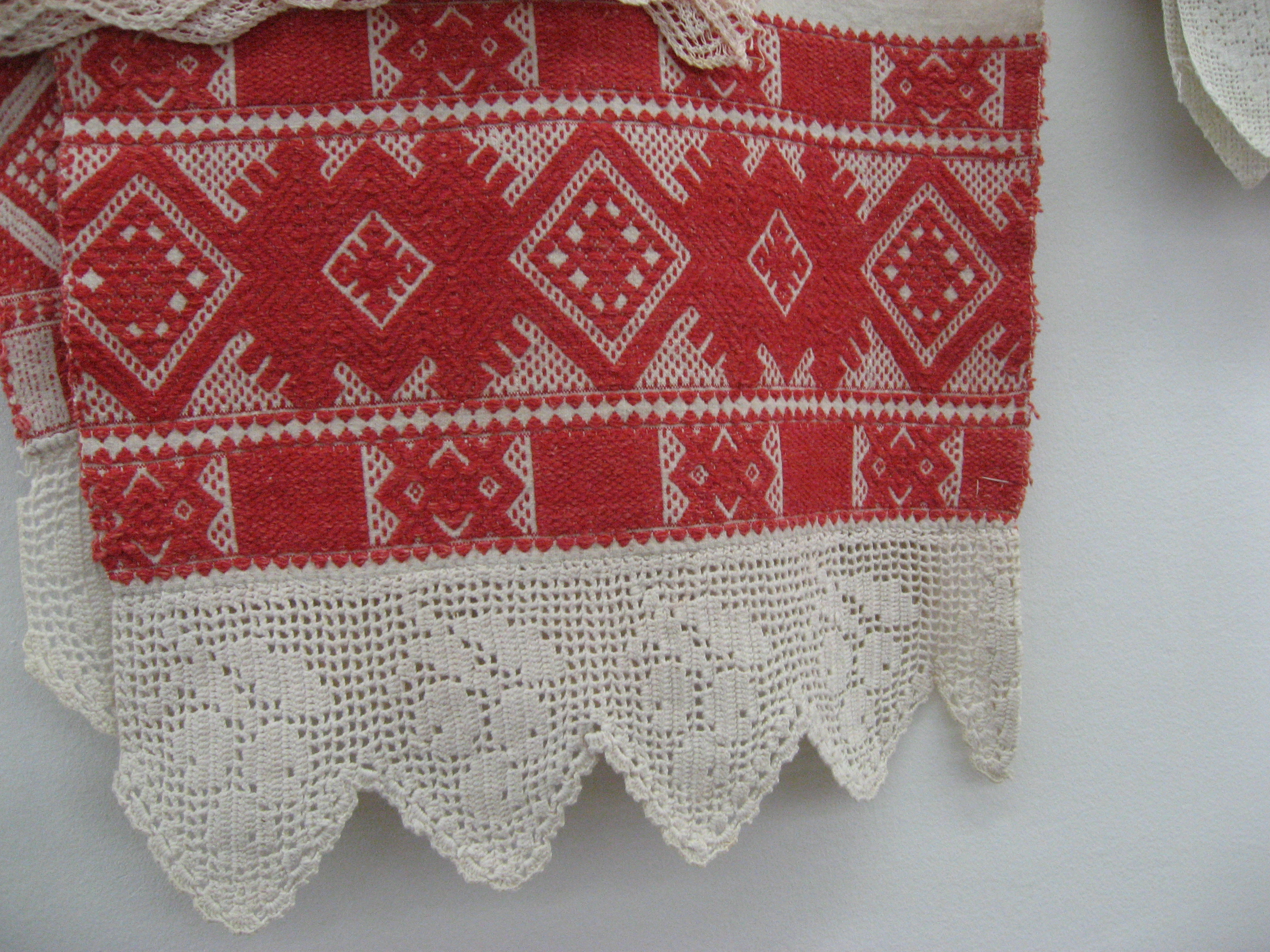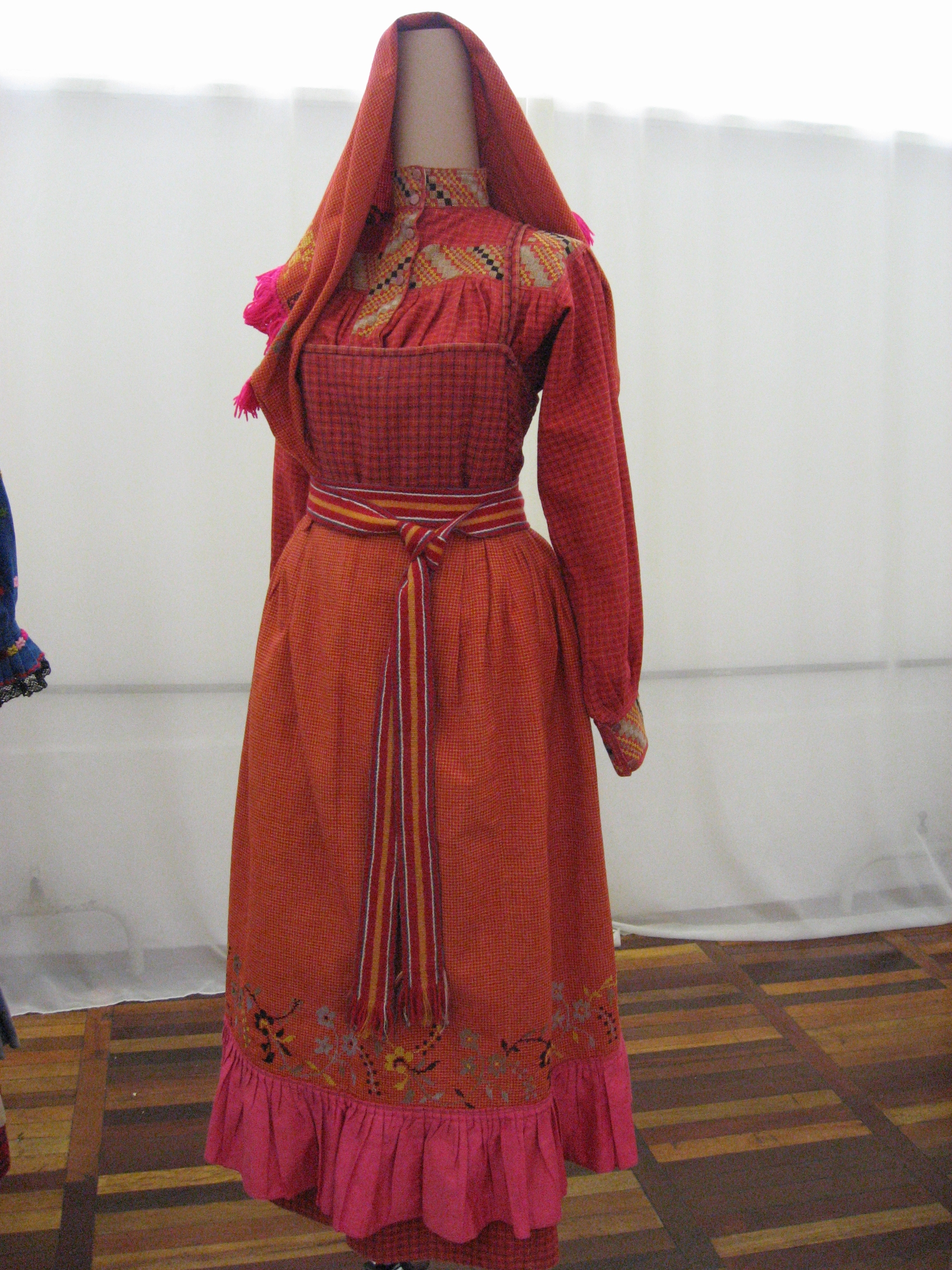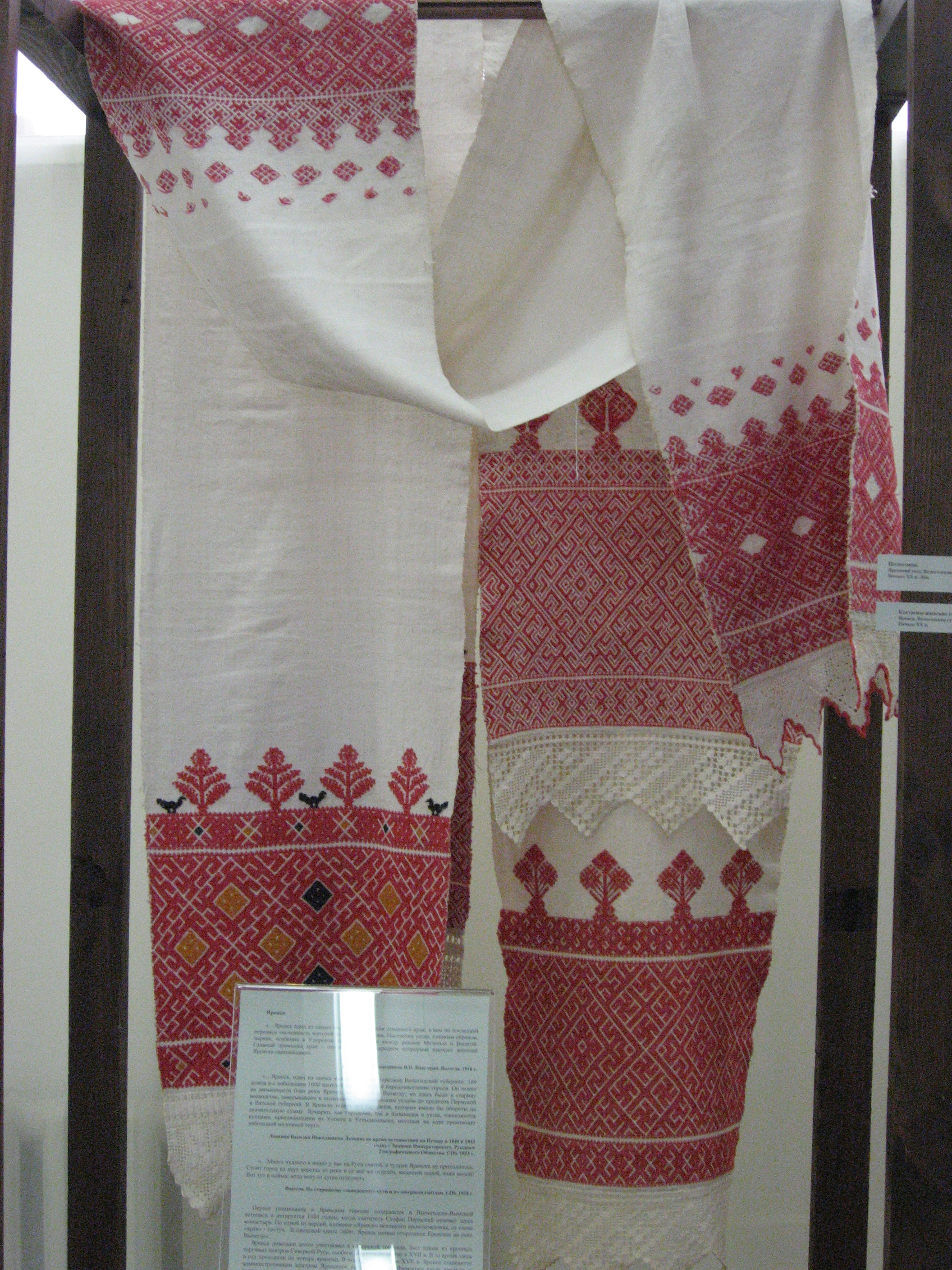На выставке в основном представлены костюмы ,вышитые полотенца с вязаной каймой,кружевоплетение , также одежду украшает вышивка. В вышитых церковных изделиях (золотное шитье) используется настоящая золотая канитель (я все разглядела .Практически все экспонаты были любезно предоставлены близлежащими регионами на время празднования . Выставка действовала всего 10 дней .