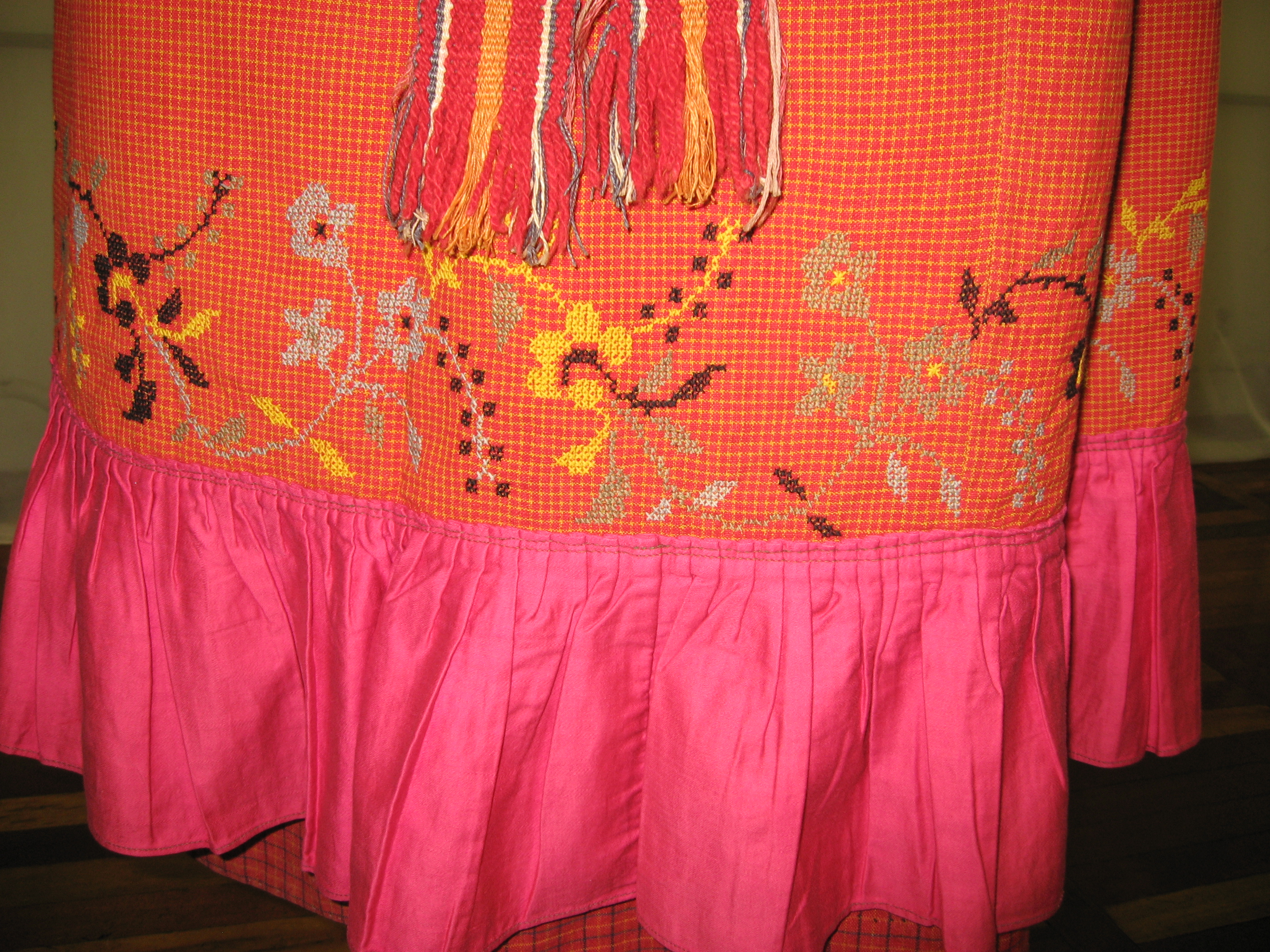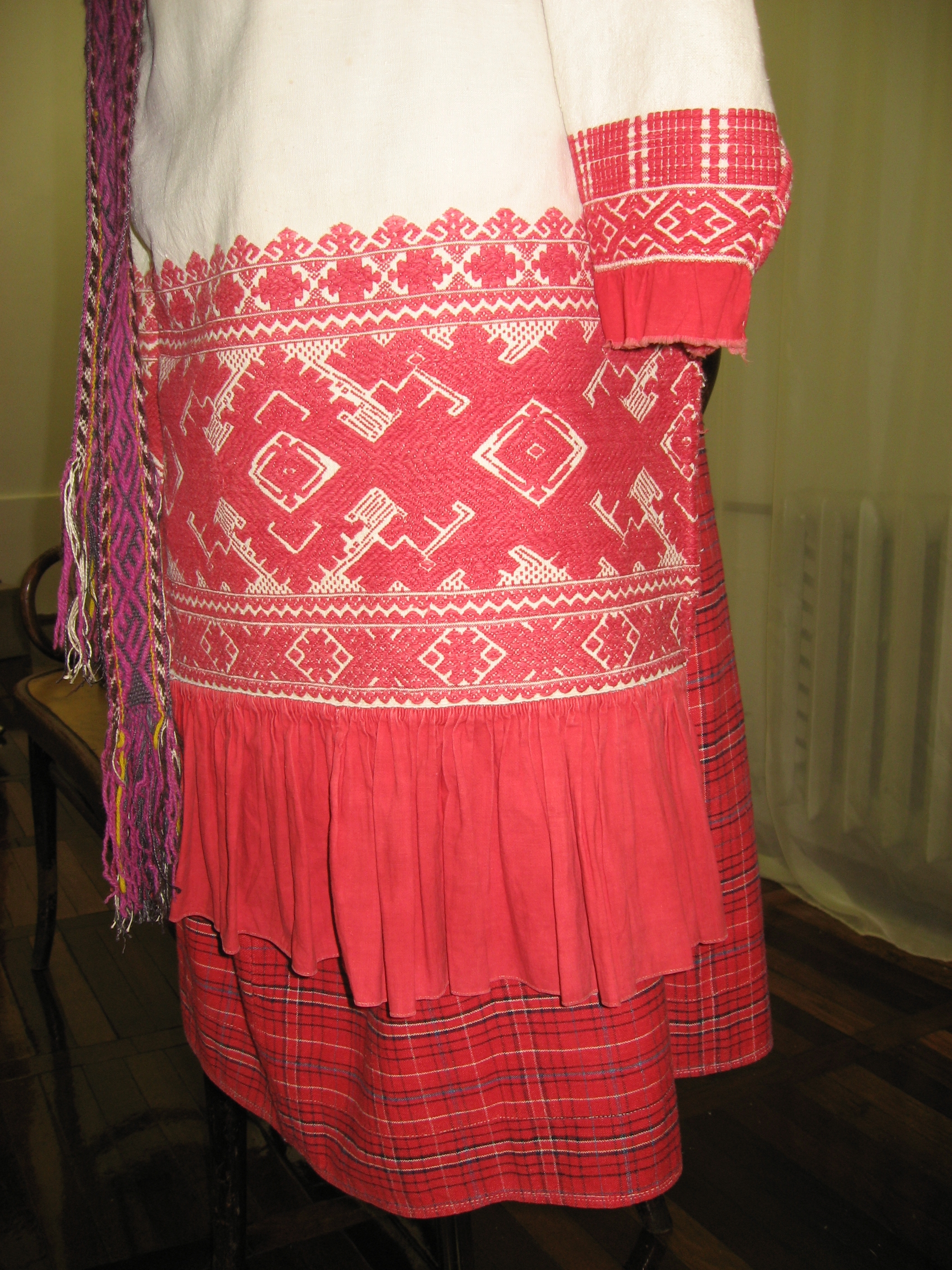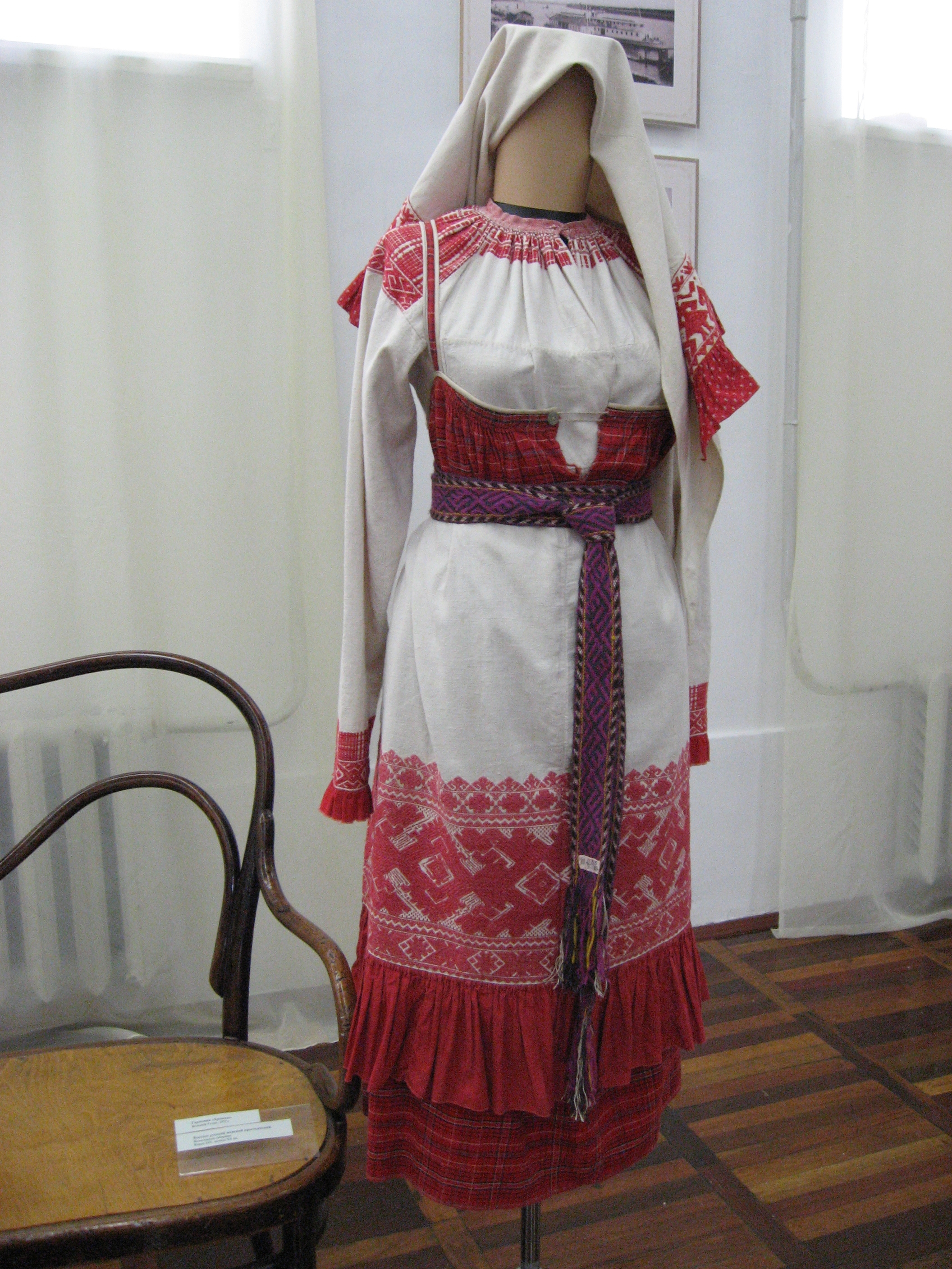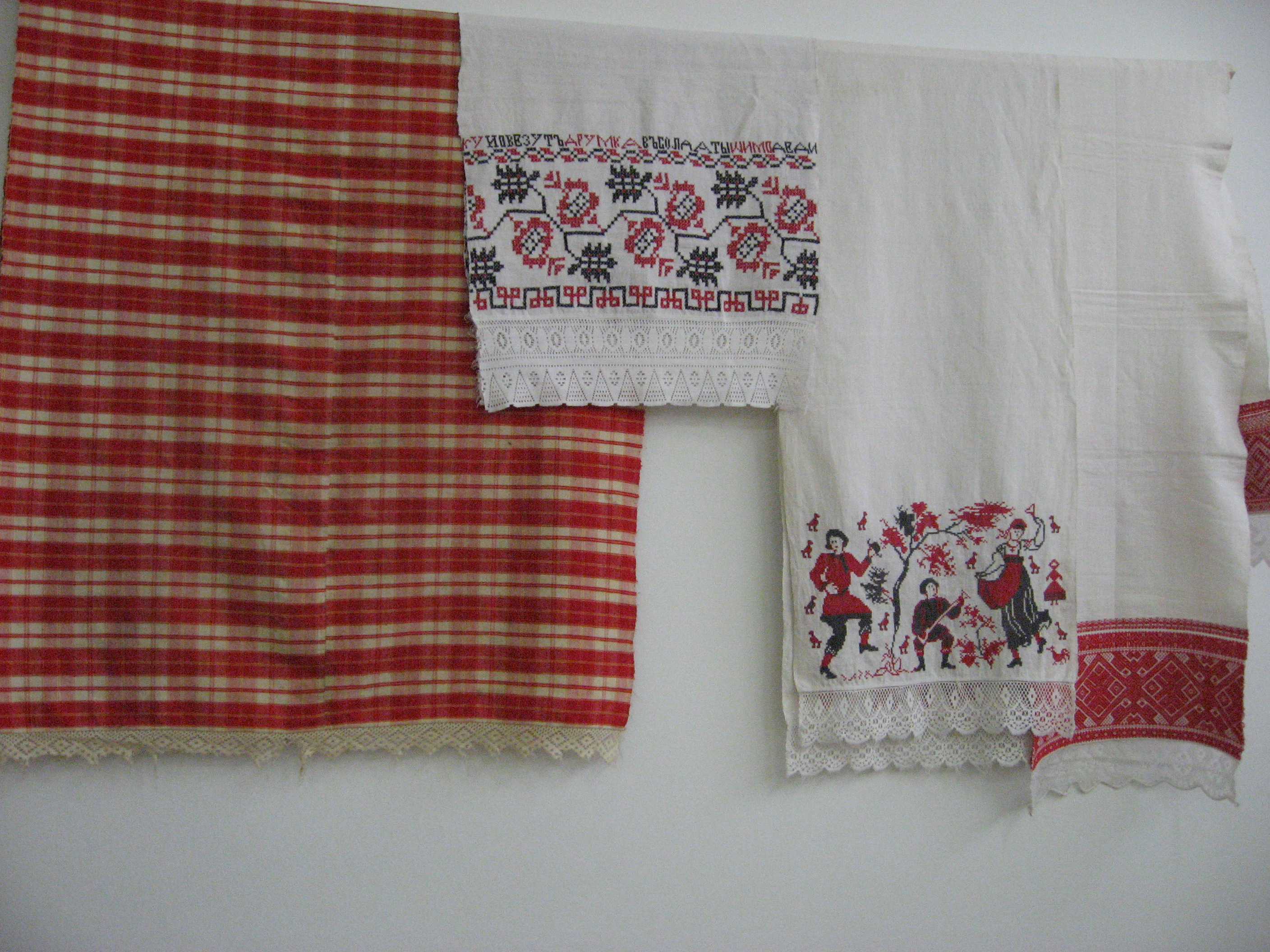 На выставке в основном представлены костюмы ,вышитые полотенца с вязаной каймой,кружевоплетение , также одежду украшает вышивка. В вышитых церковных изделиях (золотное шитье) используется настоящая золотая канитель (я все разглядела .Практически все экспонаты были любезно предоставлены близлежащими регионами на время празднования . Выставка действовала всего 10 дней .