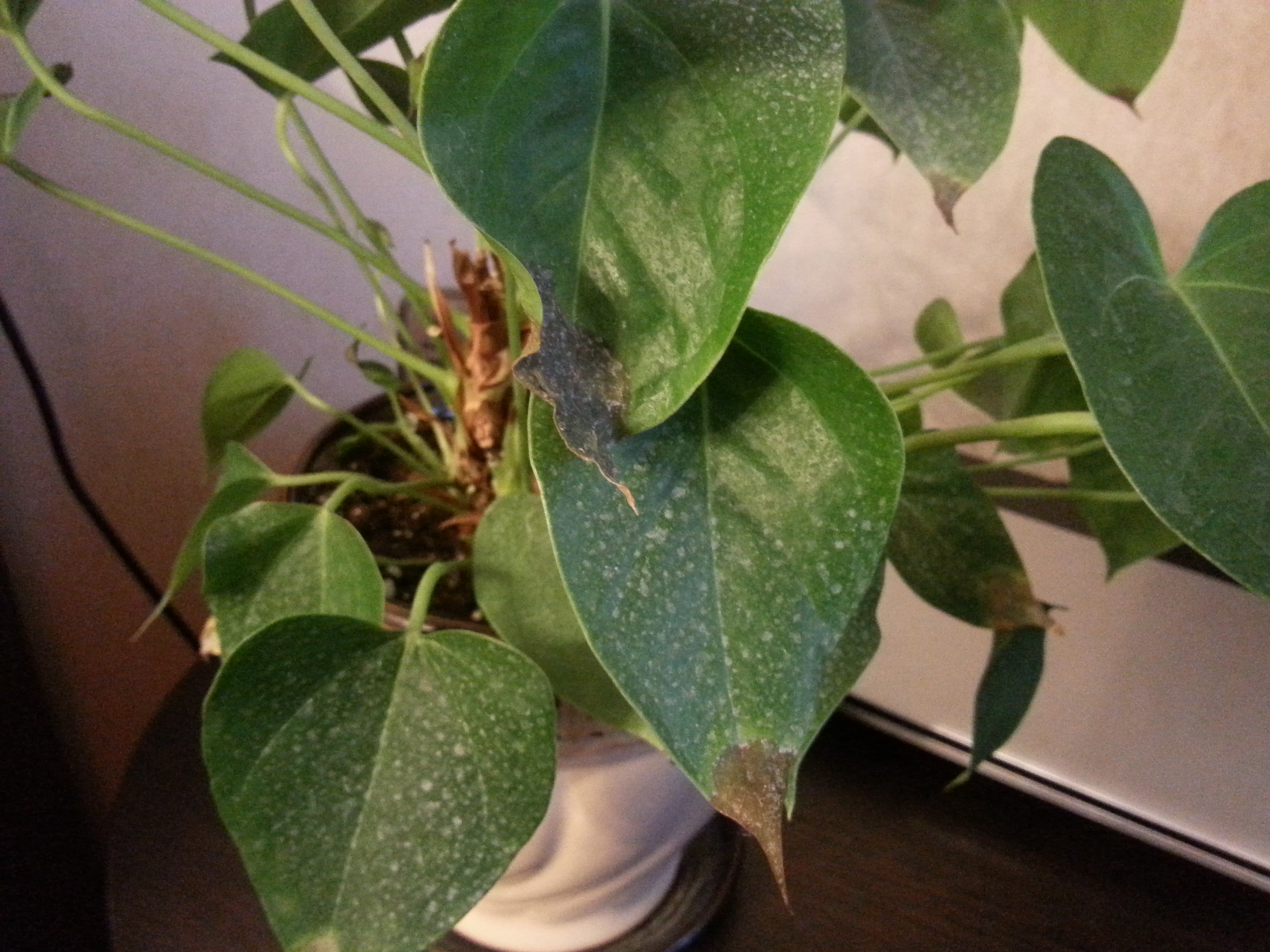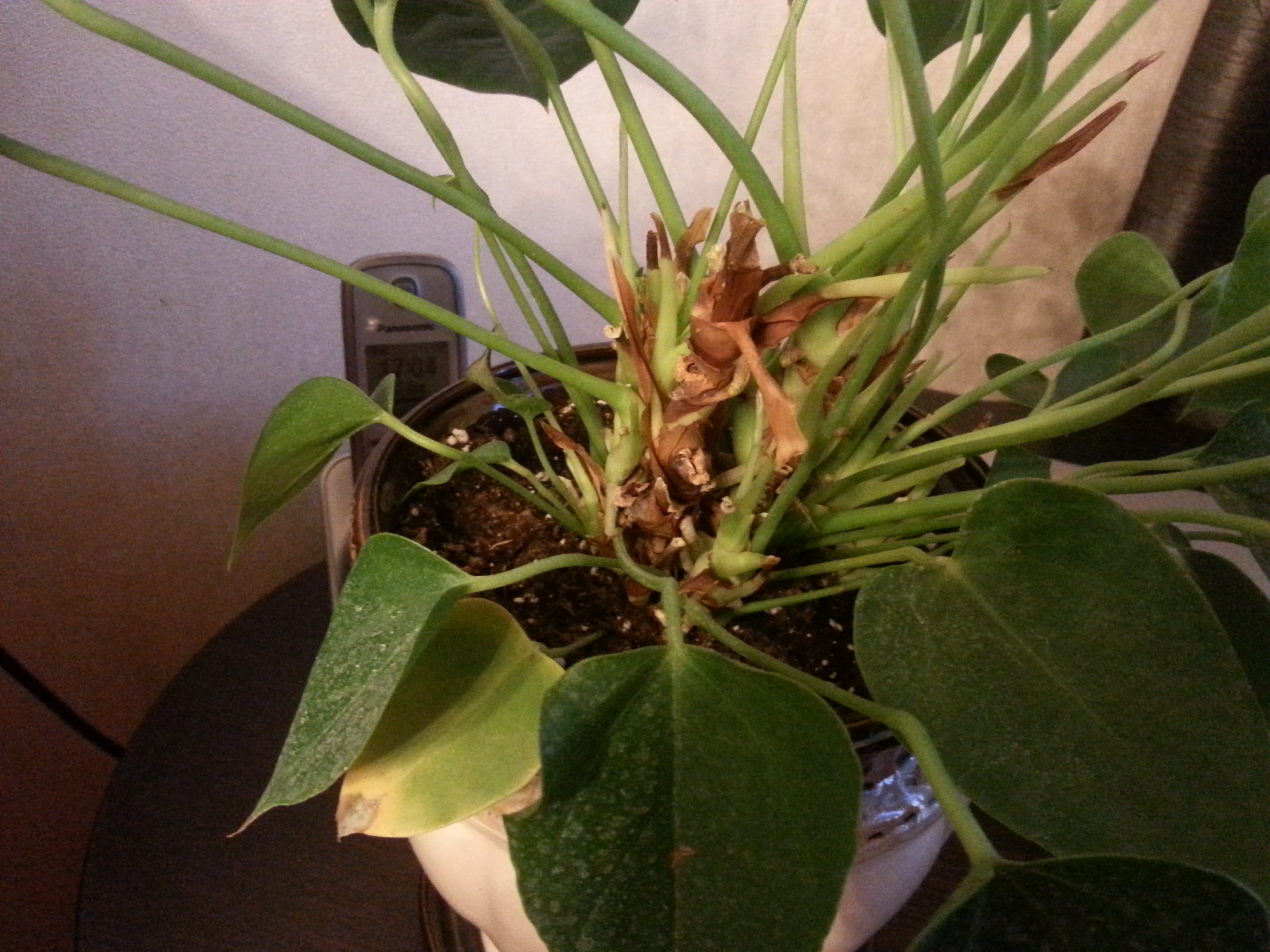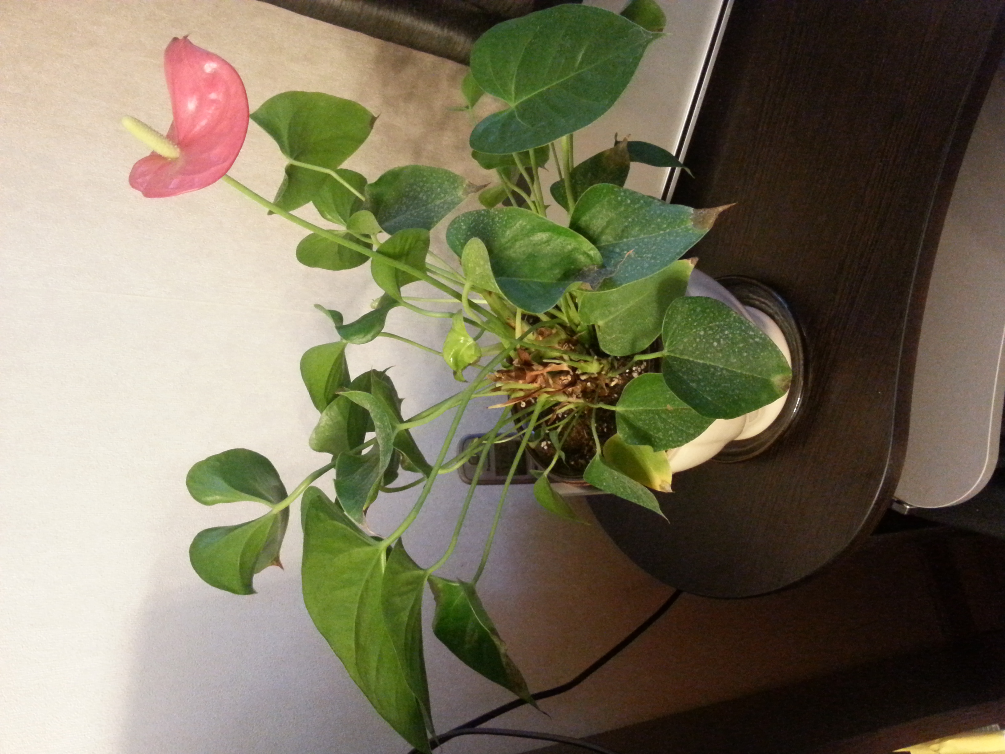 все началось около месяца назад. на листьях появились вялые коричневые пятна. поспрашивала на форумах, сказали, залила. стала поливать меньше, ничего не изменилось. решила проверить землю и корни. земля немного влажная, рыхлая, корни все хорошие, гнилых не нашла. сейчас вообще не понимаю, что с ним происходит. пожалуйста, помогите! мне очень дорог этот цветок