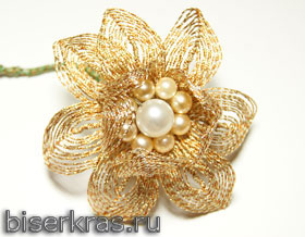 В центре цветок из жемчужных бусин: из 7-ми бусин: набрать на проволоку 6 бусин, расположить в середине отрезка. Один конец протянуть по ходу через 3 бусины, стянуть концы, образуя круг. Для центрального элемента цветка надеть 1 бусину этим же концом подобрав ее по диаметру нашего круга. Поместив ее в центр - соединить оба конца и скрутить. Сердцевинка может быть иного цвета, числом лепестков можно также варьировать.