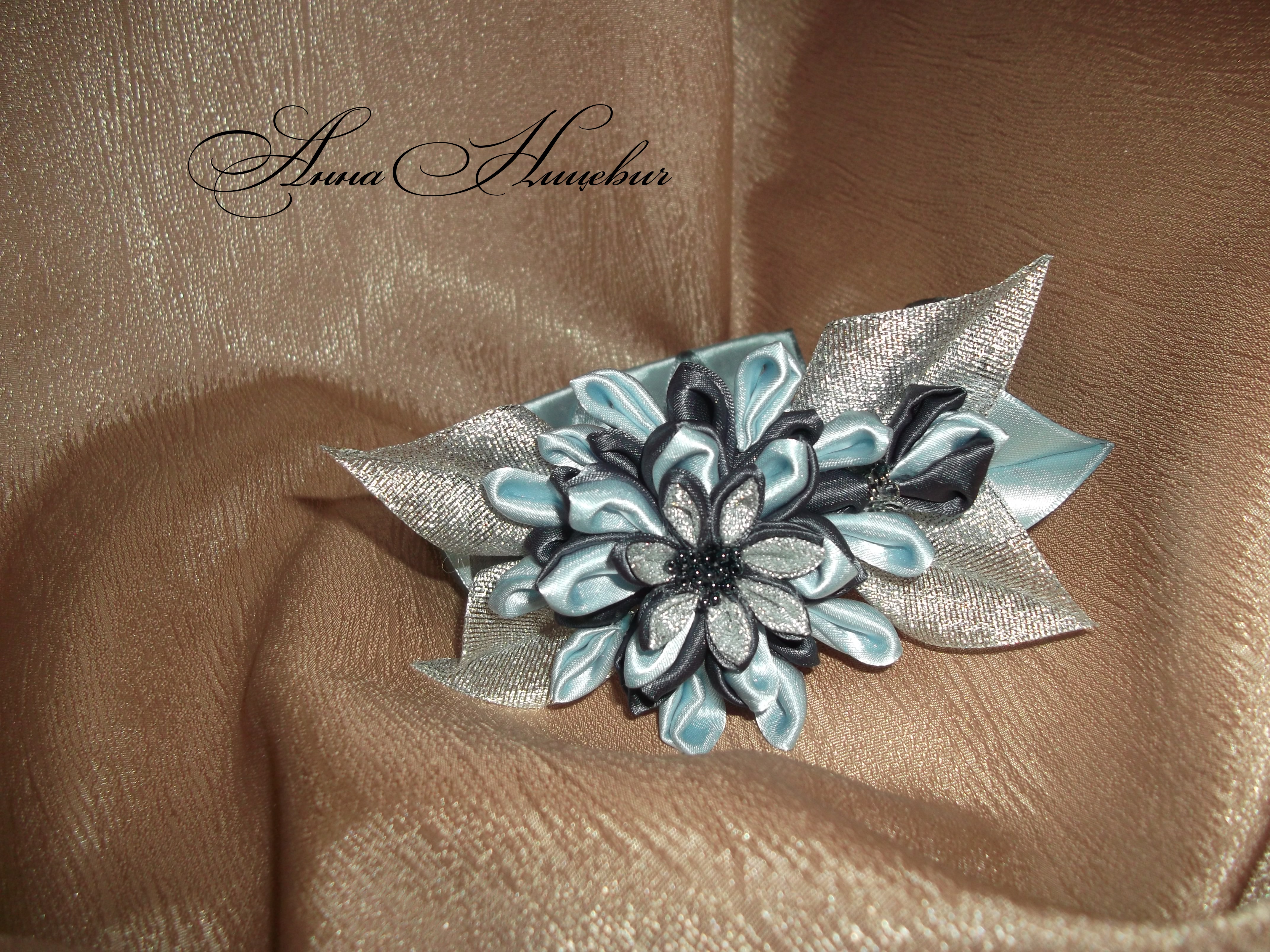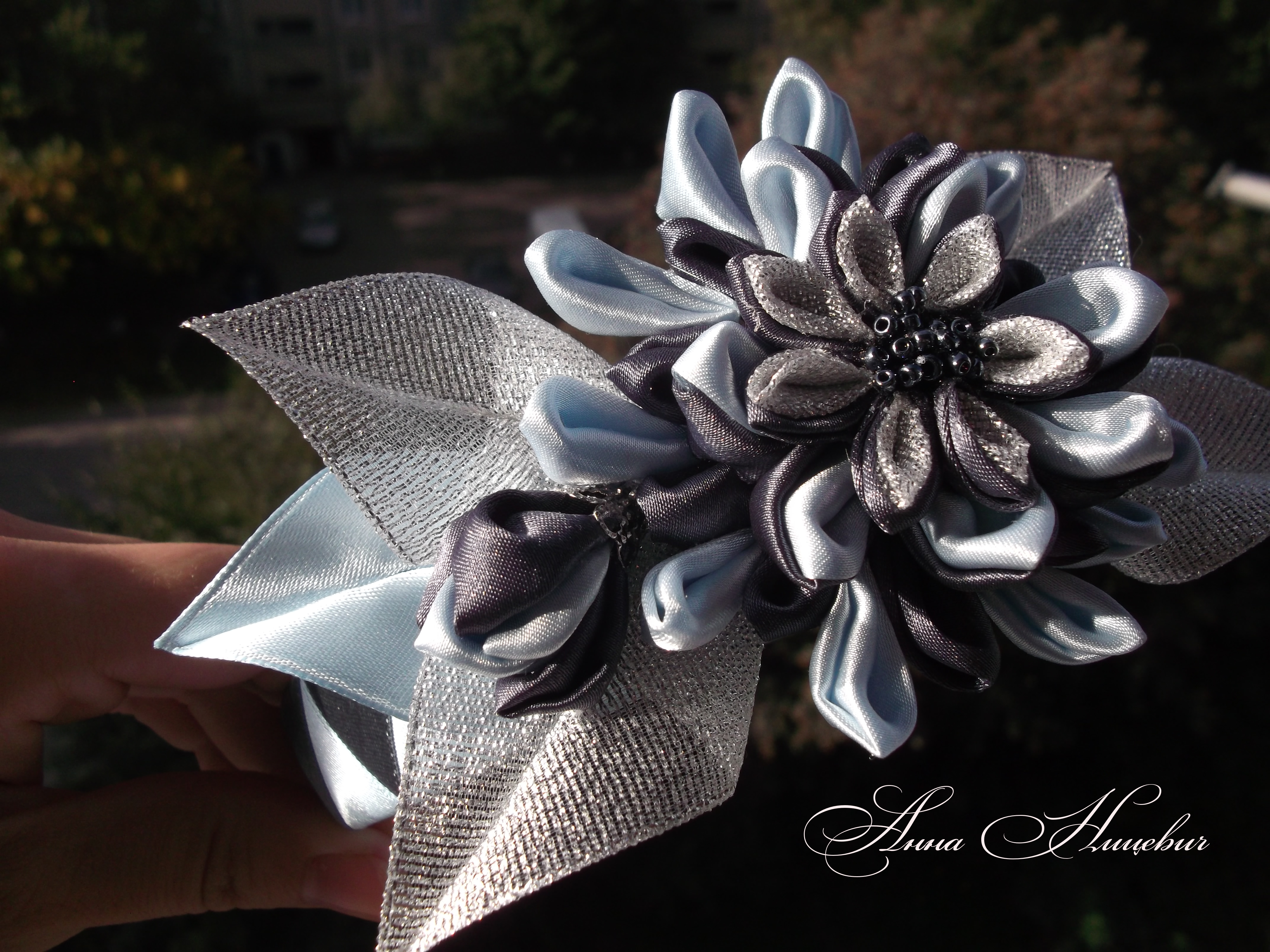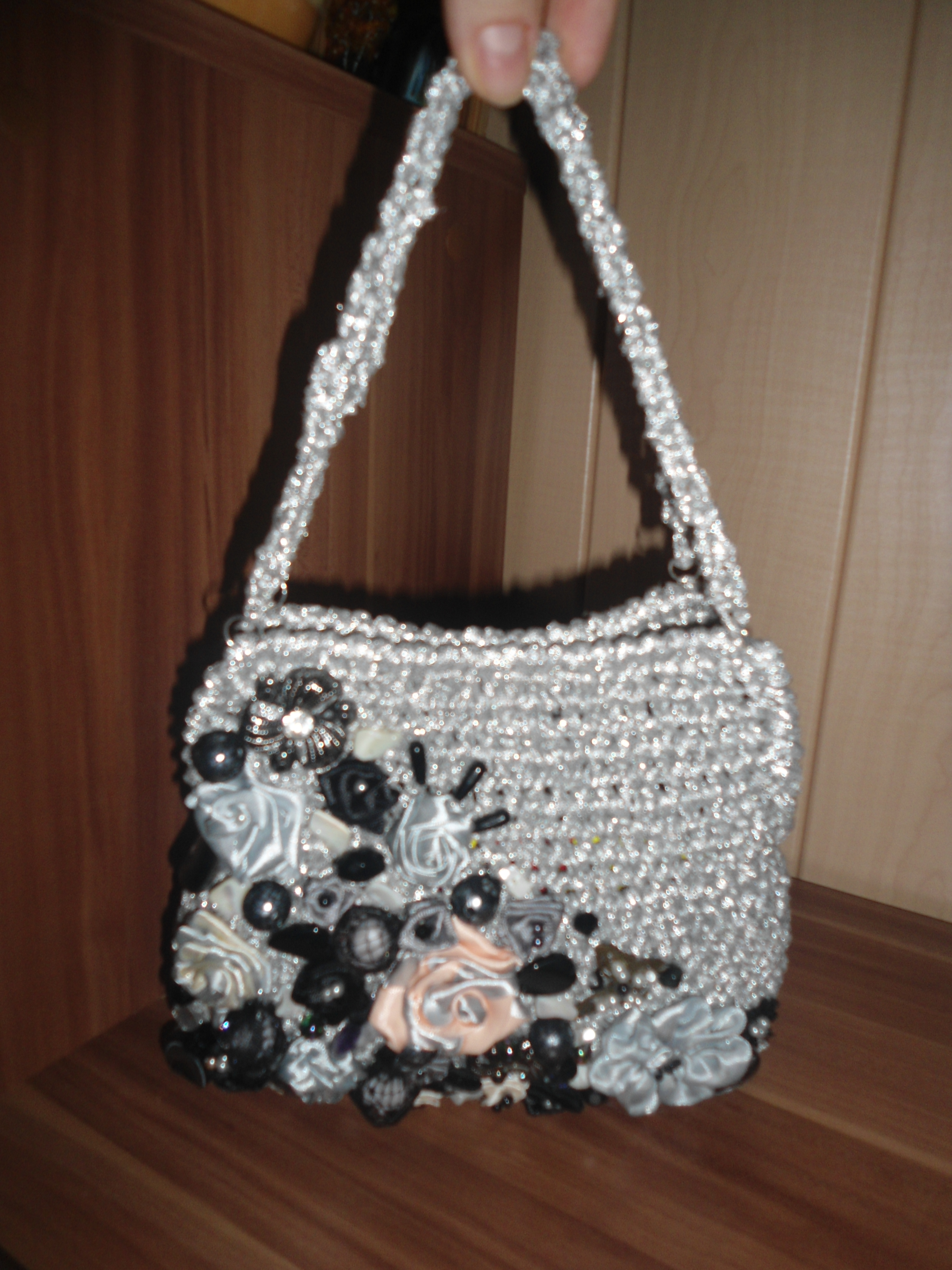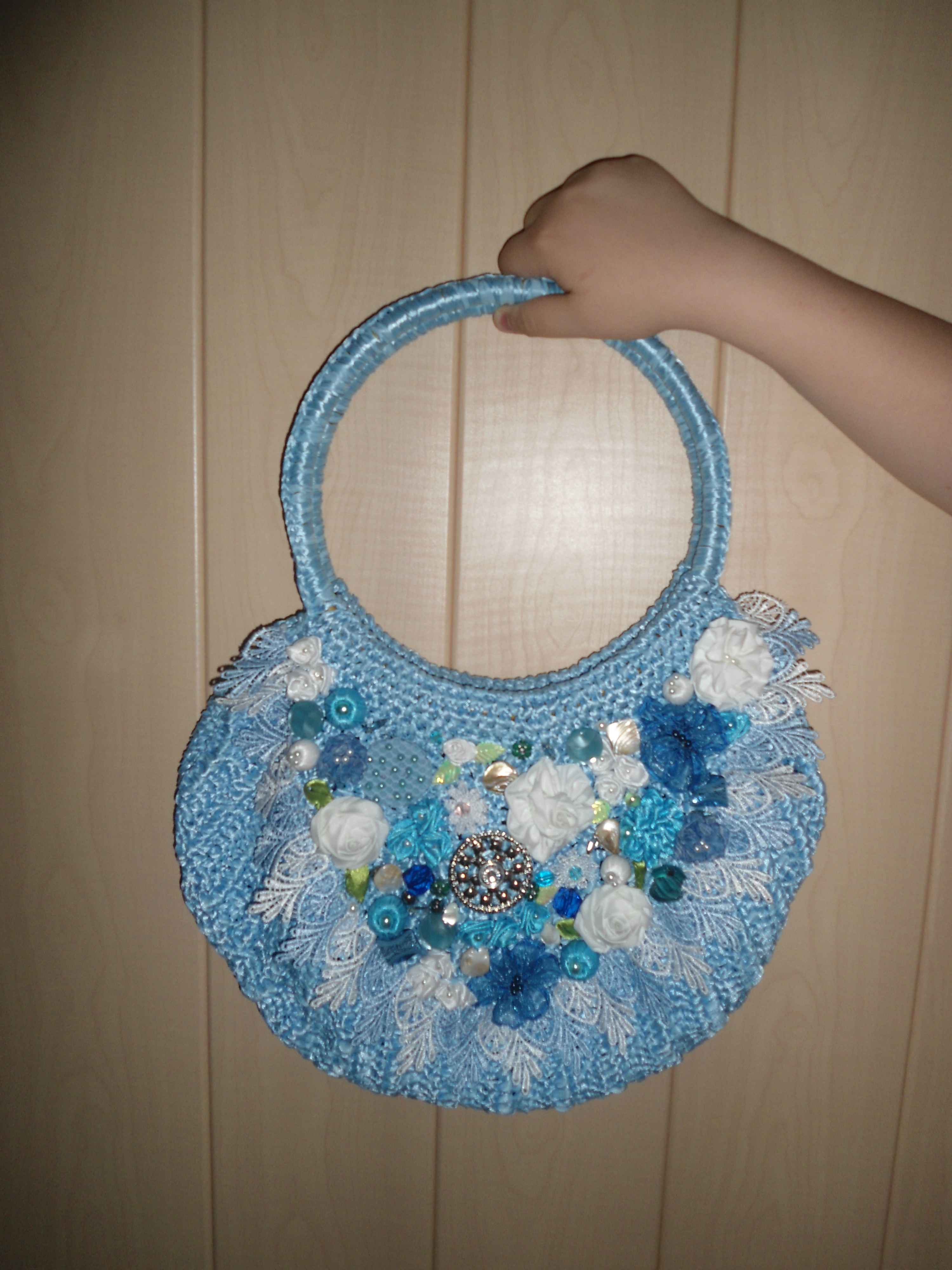 это сумочка связана из атласных лет,украшена цветами из лент.бусинами,кружевом