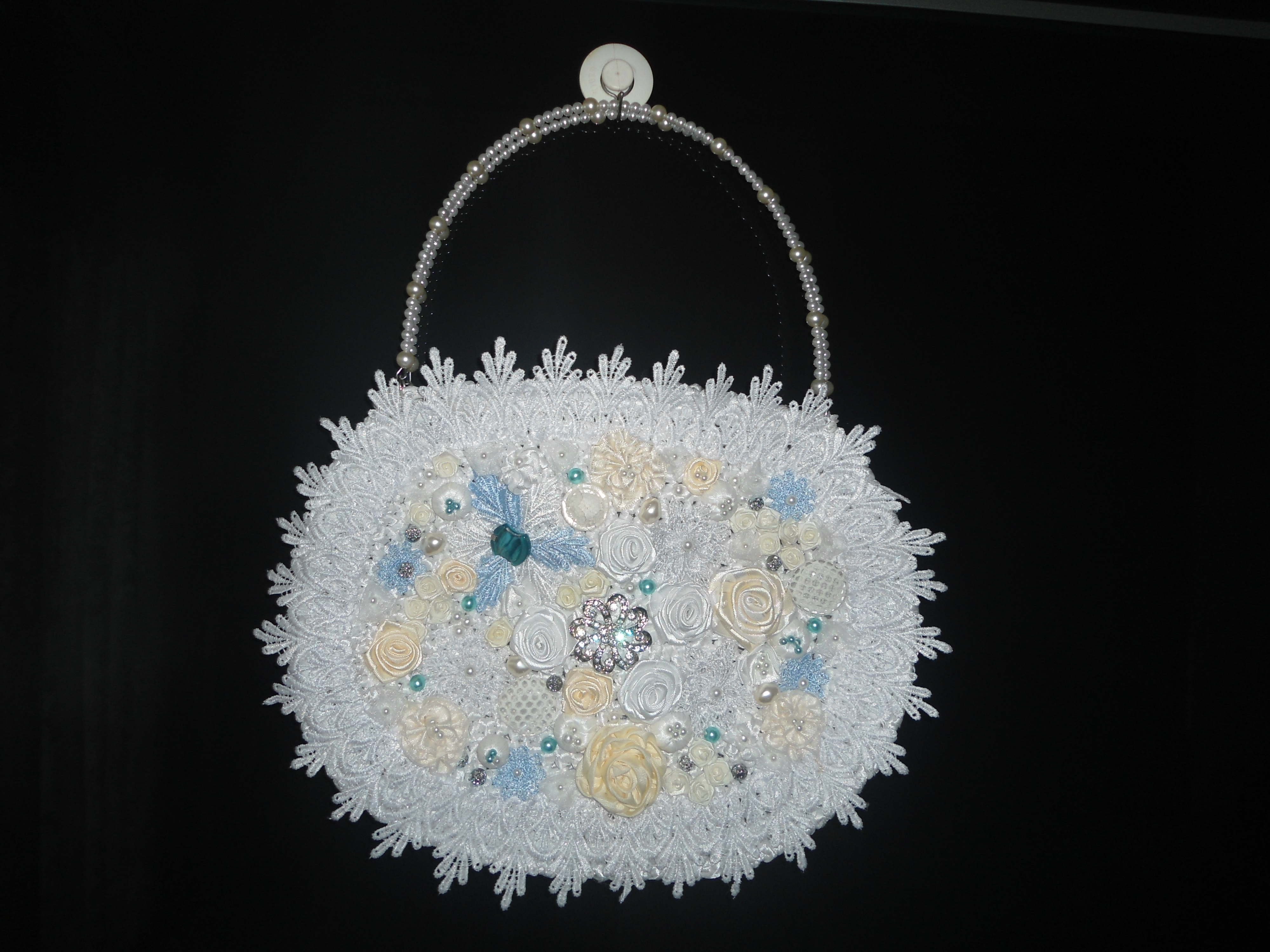 сумочка связана из атласных лент,украшена кружевом,цветами из лент,преламутром,различнвми украшениями,бисером,ручки сделаны из рояльной струны и бусин.