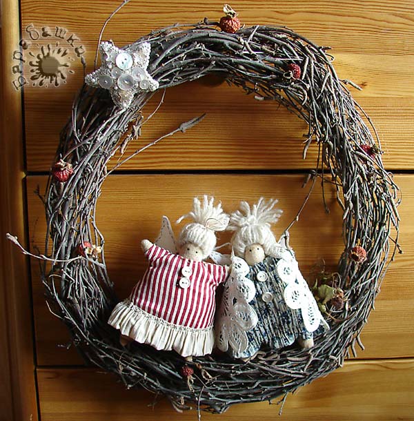 Выполнена из синтетической сетки и украшена семейными фотографиями и елочными игрушками.