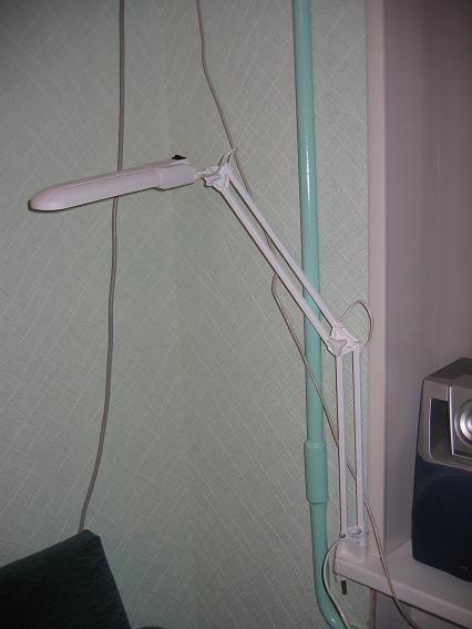 Сначала крепила лампу к подоконнику, сейчас прикрепляю её к стулу.