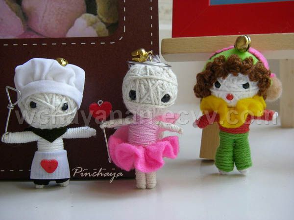 потом обматывается нитками (руки-ноги не разрезаются и не распушаются при этом). Волосы для куклы-женщины делаются из ниток, пропущенных через нитки головы и перевязанных другой ниткой у основания, концы ровно обрезаются. Глаза делаются из бусин.