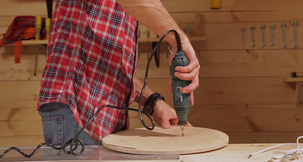 1) Чертим окружность на фанере и вырезаем её электрическим лобзиком.