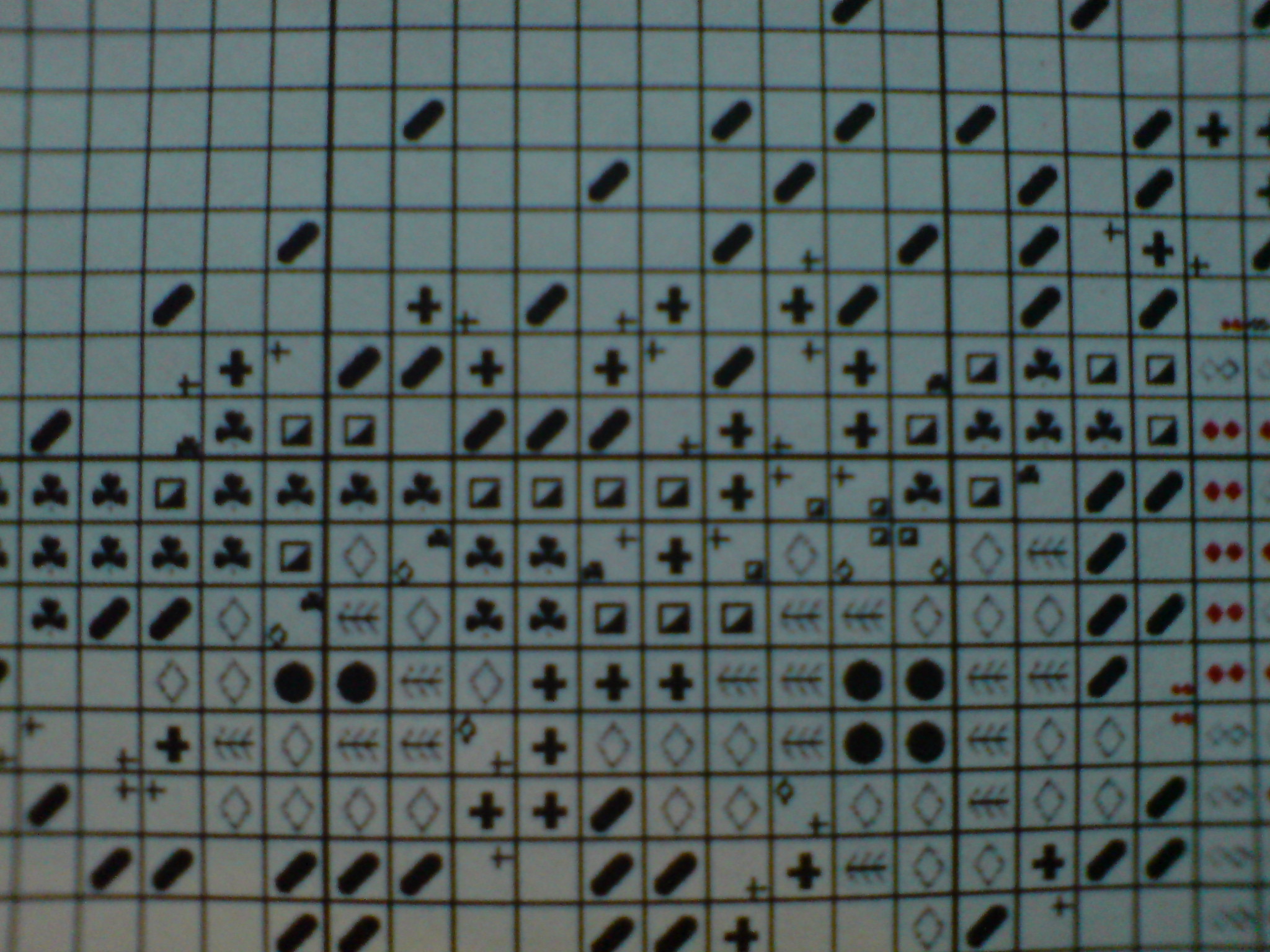 GangstaMama, если в квадратике стоит только один значек, то вышиваем только четвертинку(см. картинку там где черным цветом обозначенно), если стоят 2 значка, то вышиваем 1/4 одним цветом, а четвертинку другим.