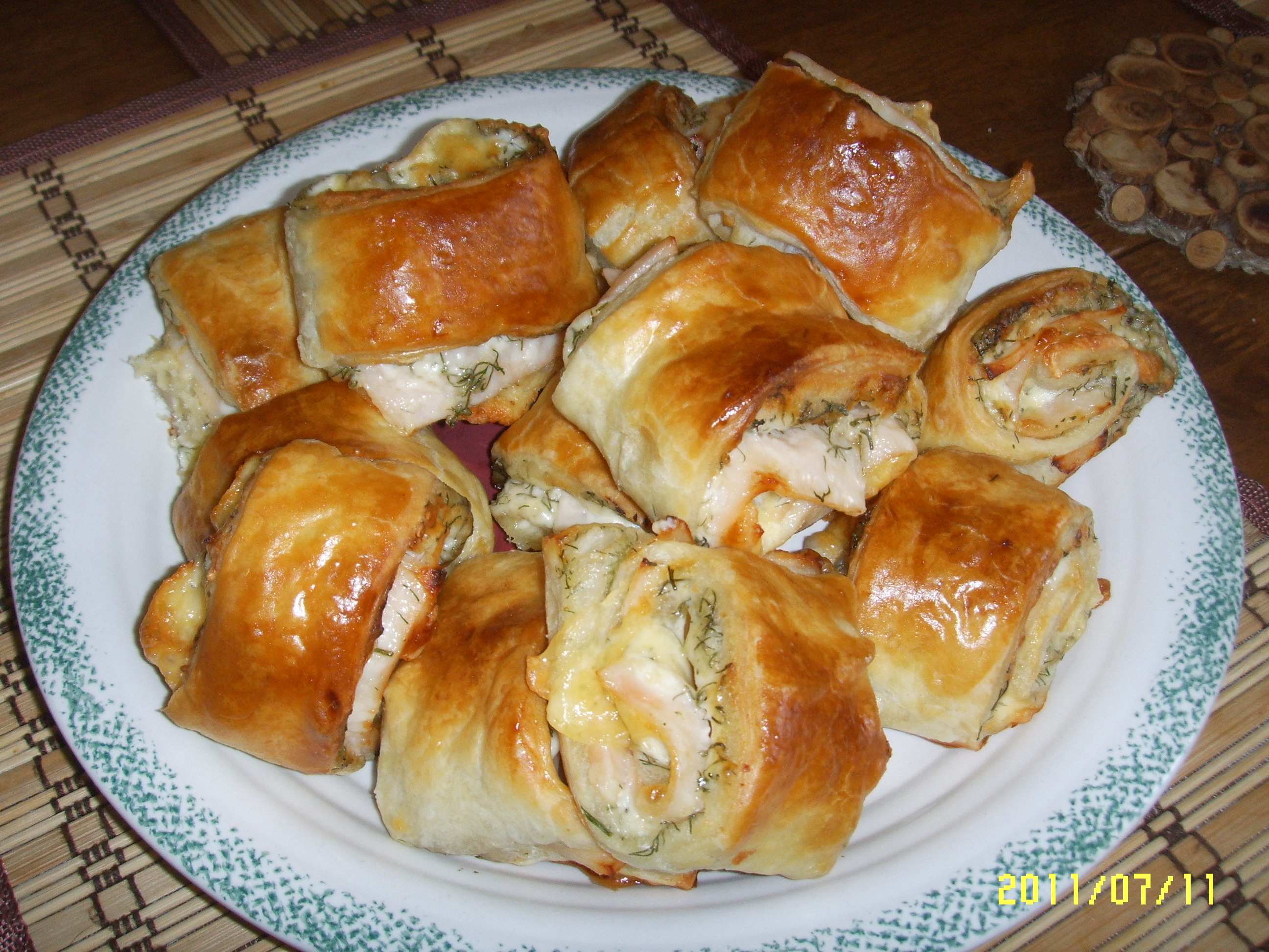 Раскатанный лист слоеного теста смазывается майонезом, посыпается зеленью, тонкими пластинками ветчины и посыпается тертым сыром. Сворачиваем в длинный рулет, потом осторожно острым ножом нарезаем на небольшие рулетики. И в духовку минут на 20 при температуре 180 градусов. Мои домашние очень оценили. Когда свежие, просто объедение и отличный завтрак.