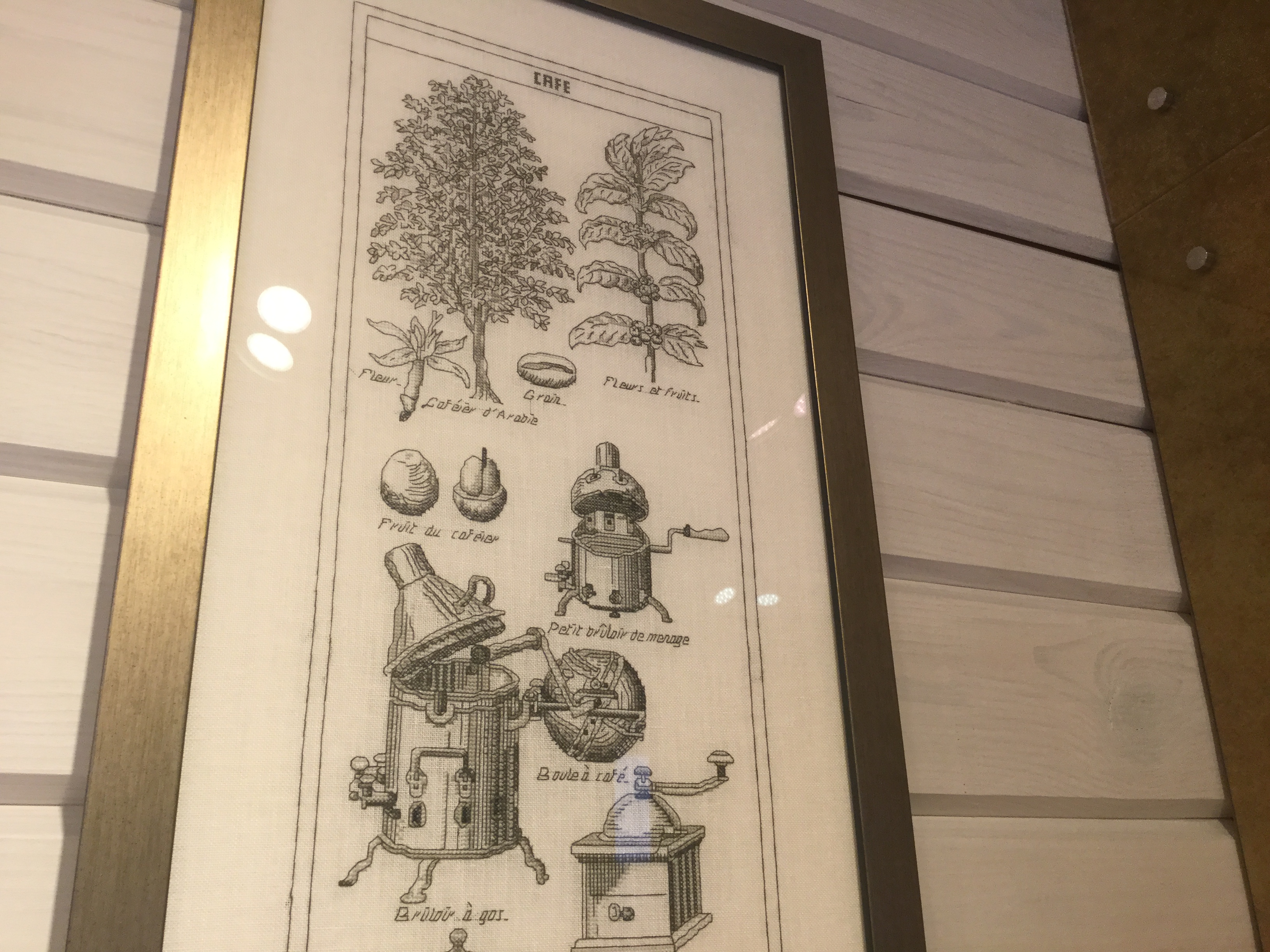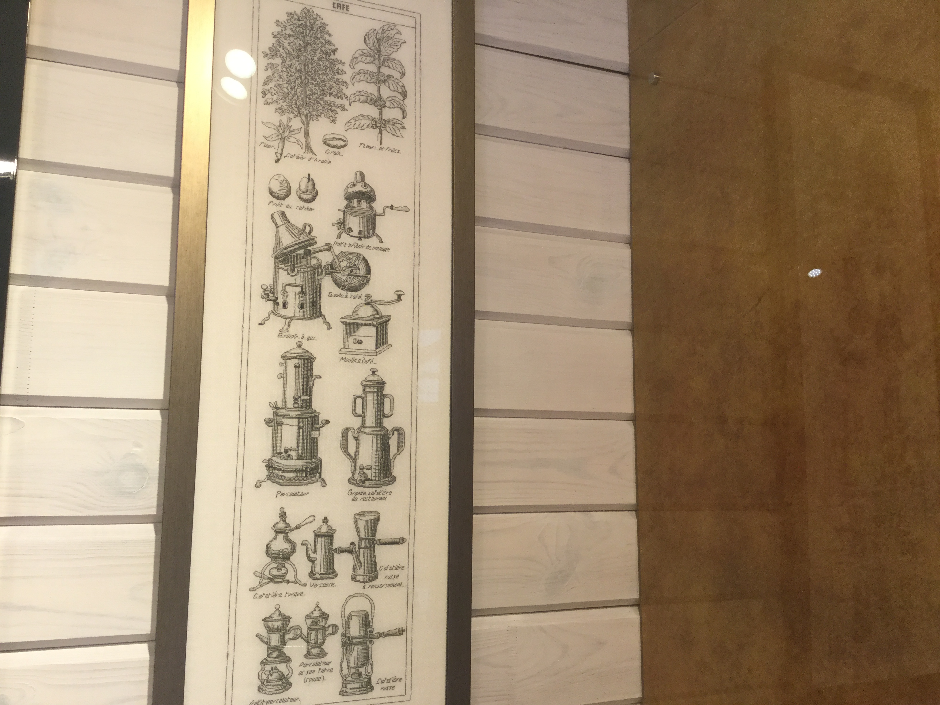Thea Gouverneur - Кофе ( разные виды старинных кофеварок и все такое) на льне. Размер больше метра, поэтому не вмещается нормально, показываю по частям)) отлично вписался на кухню. Вы бы видели глаза мастера в багетке когда я развернула перед ним эту простыню)))