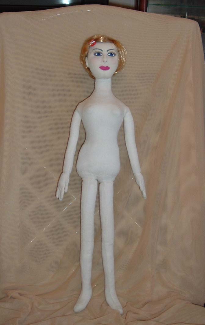 Ника Земляника,ты уже начала делать куклу?Свою куклу я делала на проволочном каркасе,поэтому она может сидеть и сгибать руки в локтях.Вот такая кукла у меня была в начале.