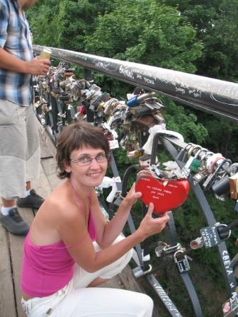вот у меня есть фотка с моста с замками! Я сфотографировалась с самым сердешным замочком. Он же оказался и самым большим! Сразу видно, люди готовились к свадьбе!