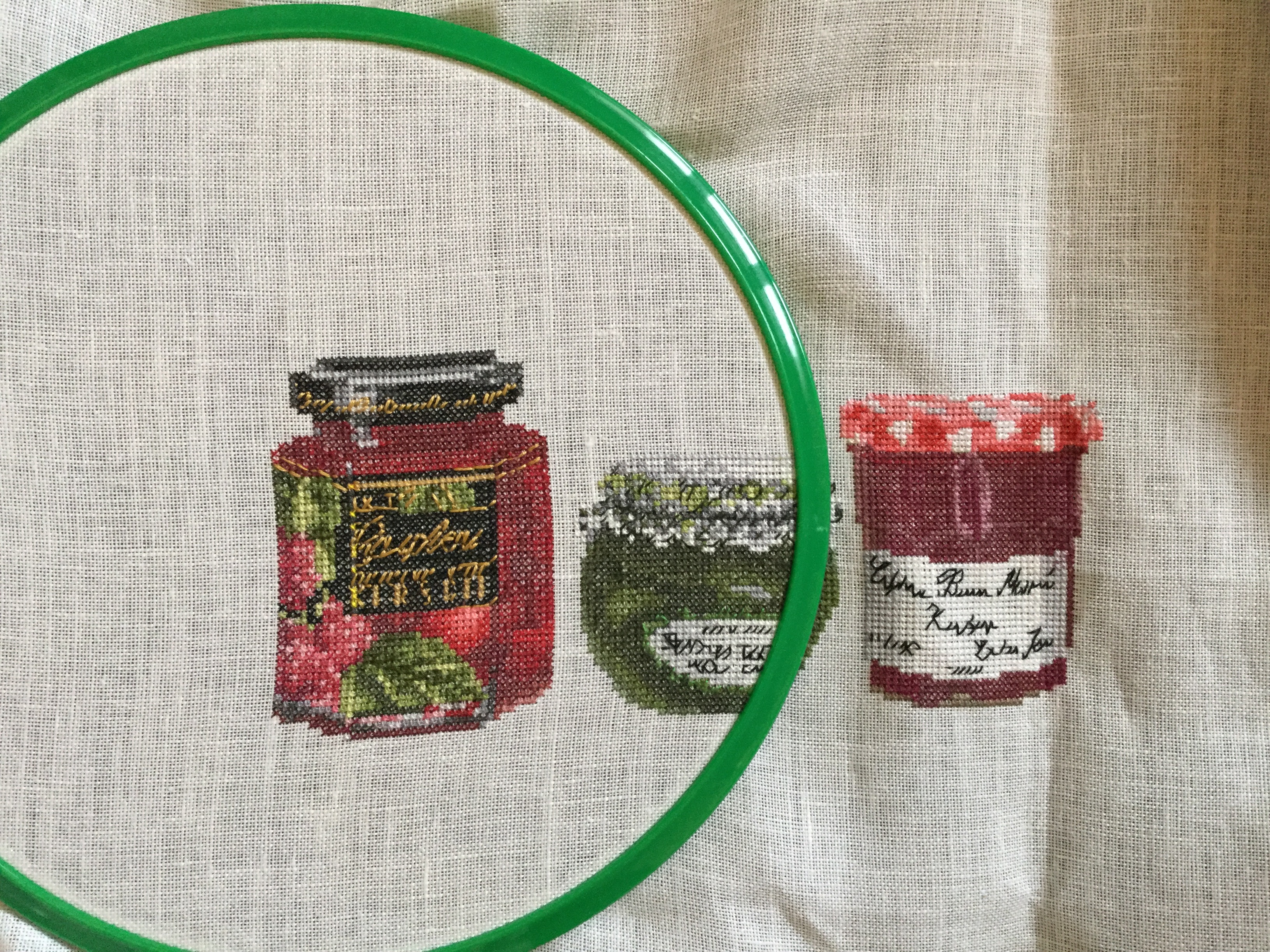 И достала давнишний процесс - баночки с вареньем от Теи , давно вышиты к ним пироженки и банки с горчицей из этой серии. Так что я села и на удивление быстро вышила целую баночку! Чему очень рада! Надеюсь что быстро доделаю все!