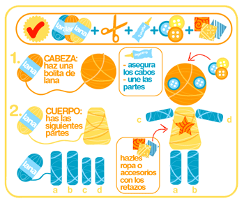 потом обматывается нитками (руки-ноги не разрезаются и не распушаются при этом). Волосы для куклы-женщины делаются из ниток, пропущенных через нитки головы и перевязанных другой ниткой у основания, концы ровно обрезаются. Глаза делаются из бусин.