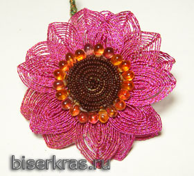 2 – НИЗАНИЕ ДУГАМИ ИЗ СКРУЧЕННОЙ МЕТАЛЛОНИТИ, т. е. тонкая проволочка скручивается с цветной нитью и из этой металлонити французской техникой бисероплетения - низанием дугами формируются легкие, воздушные лепестки. Этот способ достаточно не прост, но сама техника рукоделия не настолько сложна, насколько кропотлива, требует терпения, аккуратности и времени.