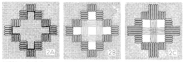 При помощи мальтийского креста можно заполнять как большие, так и маленькие ячейки. Основой разделки являются так называемые четверти мальтийского креста. Они вполняются штопальным швом, которым перевивают две перемычки сетки, расположенные друг к другу под прямым углом. При вышивании четверти мальтийского креста можно сделать как несколько штопальных стежков, так и заполнить ими всю ячейку.