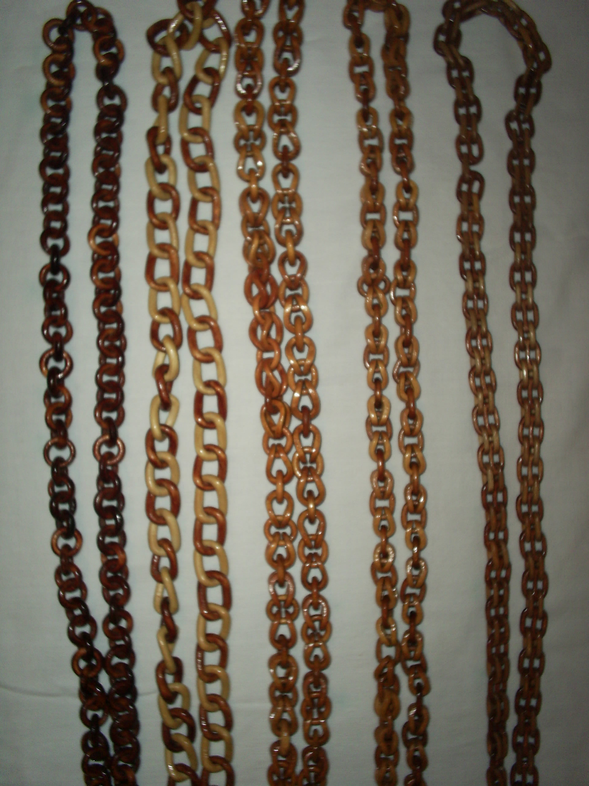 | Я видела, как отец вырезал кубик из дерева, потом из кубика звено цепочки, потом разрезал это звено пополам, собирал цепь и склеивал звенья, потом покрывал морилкой и лаком.