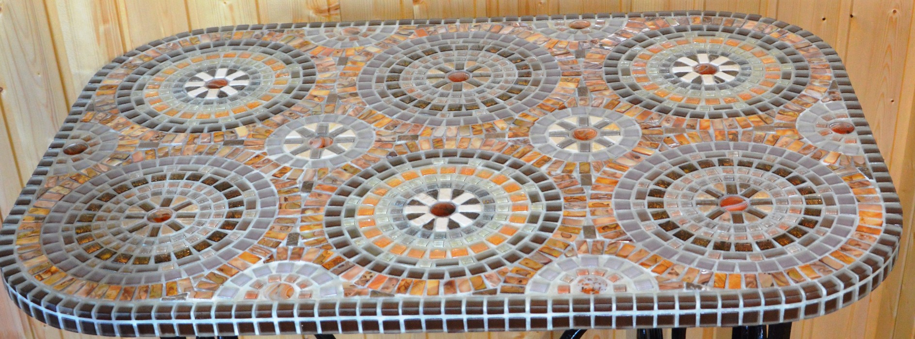 Мозаика выложена из кусочков керамической плитки, затем залита эпоксидной смолой с обратной стороны.