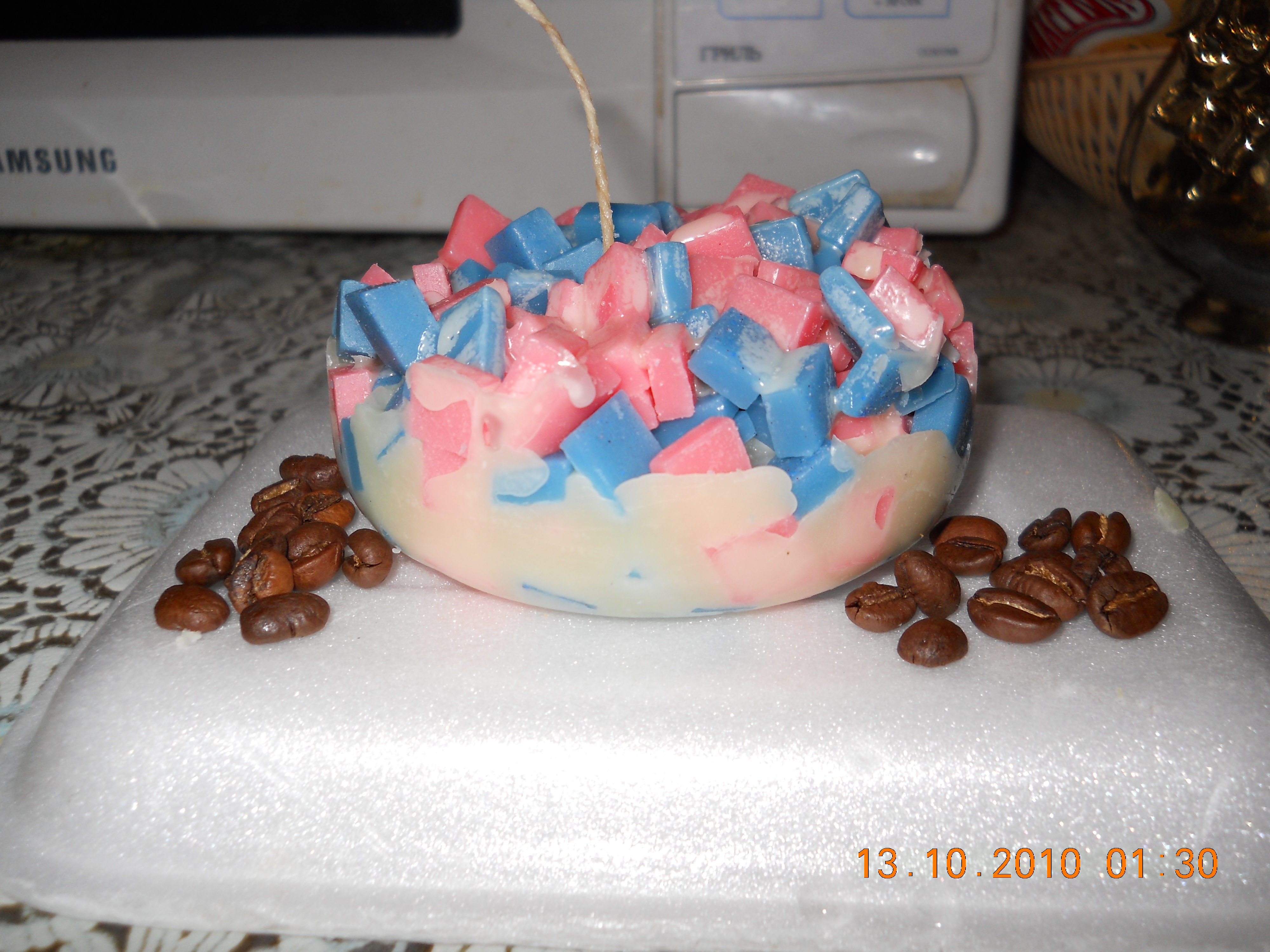 Есть еще один способ – когда парафин расплавлен и снят с огня, в него добавляют пищевой краситель и быстро размешивают.Также применяют жировые красители : они отлично растворяются в парафине и дают ровные насыщенные тона.