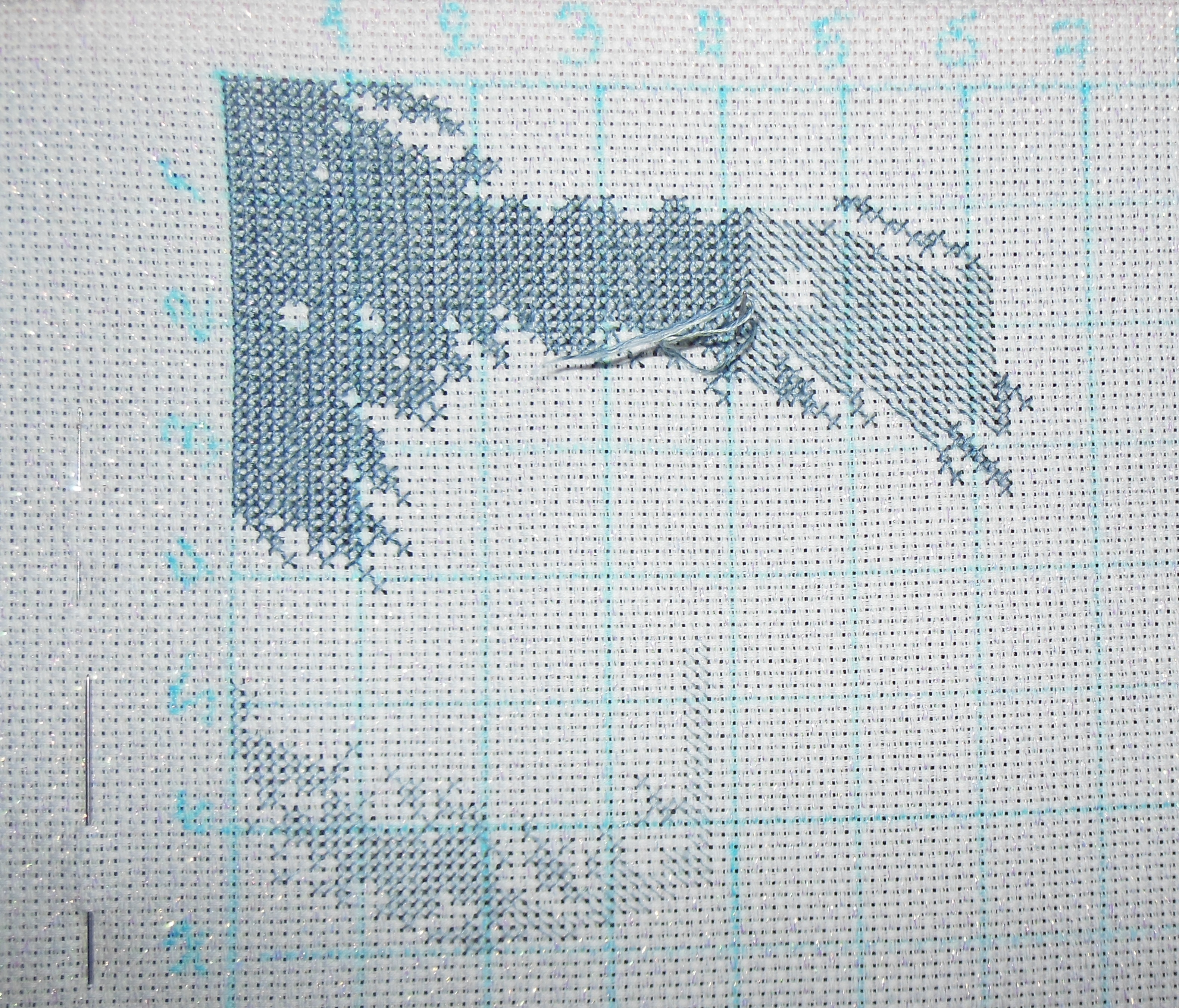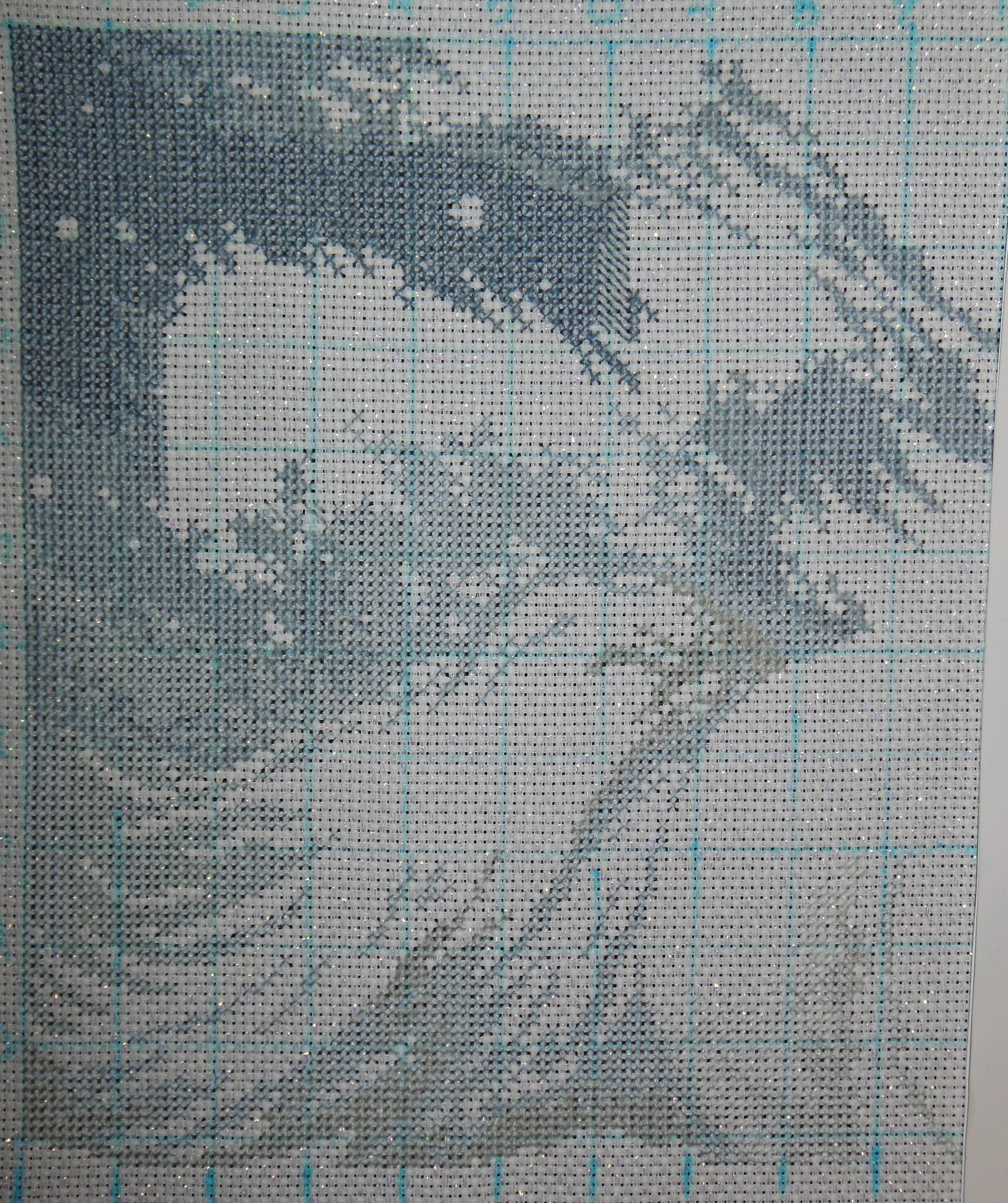 Размер 50х39 см, канва Аида 14 (Zweigart) белая с люрексом, мулине + бисер.