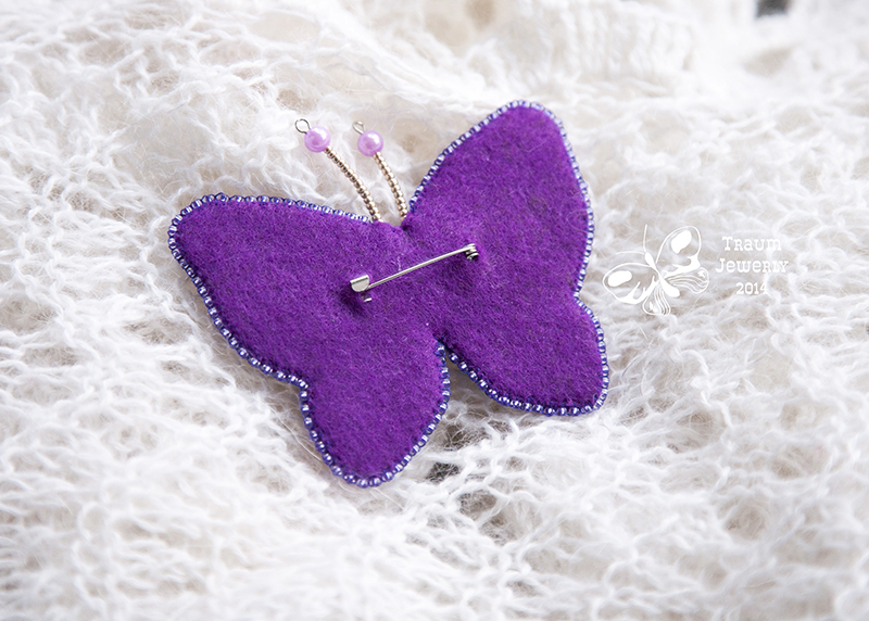 Я от руки и без высчитывания идеальности контура нарисовала на бумаге бабочку такого размера и формы, который мне подошел, сложила кусочек бумаги с рисунком ровно пополам, вырезала по одной из сторон (чтобы сделать ее симметричной). Затем обвела шаблон на фетре. Заранее нет никакой схемы или даже идеи. Просто выкладываю вокруг себя весь материал, который имею, в задуманном цвете/цветах. Во всех бабочках начинаю с тельца, затем вышиваю контур. Здесь важно, что пришиваю каждую бисеринку отдельно и через готовый контур протягиваю нить еще раз. А потом начинаю заполнять крылышки так как в голову придет в тот момент. Когда бабочка вышита делаю усики из пинов и бисера/бусин. Усики приклеиваю с изнанки вышивки. Из фетра вырезаю второй шаблон бабочки, намечаю где будет выходить основа для броши, прорезаю там отверстия. Основу для броши приклеиваю сразу и к изнанке вышивки и к только что вырезанному фетровому шаблону. Затем прохожусь клеем по всей поверхности вышивки, соединяю обе фетровые части (вышивку и ту часть в которой только что сделали прорези для основы). Обшиваю край бисером. Брошь готова
