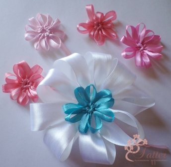 "Flowers" - цветочки из лент в технике фриволите. Плетутся быстро и легко. Их можно использовать в таких заколках, например.