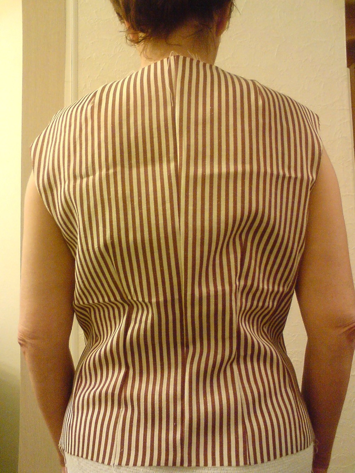 Здравствуй Гунька! Вот что у меня получилось. Такое ощущение что макетку тянет вверх. Прочитала журналы и книгу внимательно, сделала замеры заново, сравнила их с замерами которые нам делали на курсах, уменьшила Дст. Это изделие конечно получше, но... . Почему такая ерунда ниже лопаток. Может это связано с прогибом спины, но перегибистой считается фигура у которой попа выступает дальше спины или я не права? Горловина тоже не прилегает по плечам.