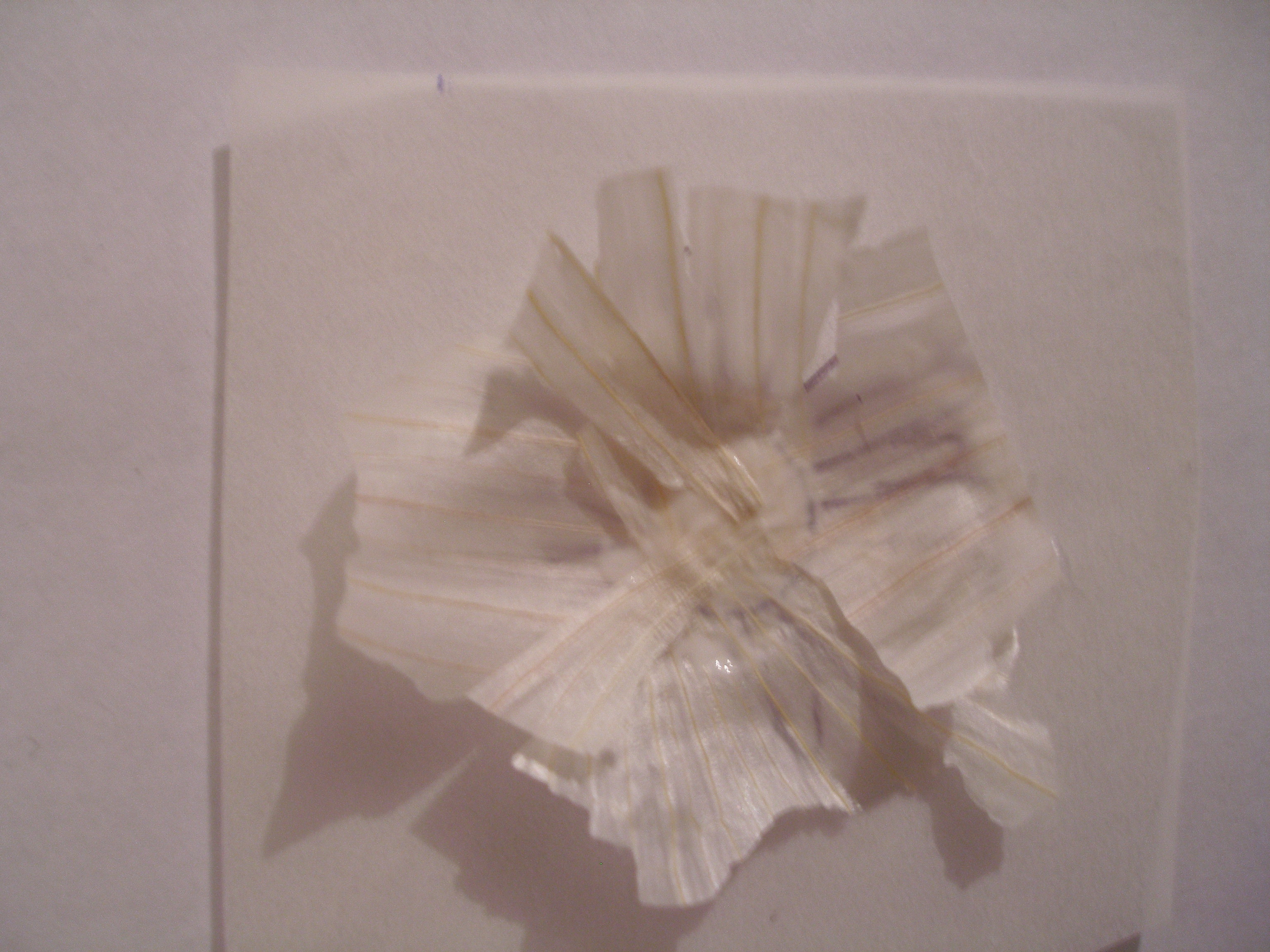 Ромашку рисуете на кальке. Сверху на серединку капаете клей и приклеиваете кусочек шелухи чеснока, стараясь чтобы жилки шли вдоль лепестков. Теперь уже на него немного клея и сверху новый кусочек и так пока все не заполните. Потом вырезаете по контуру и отдираете аккуратно кальку.