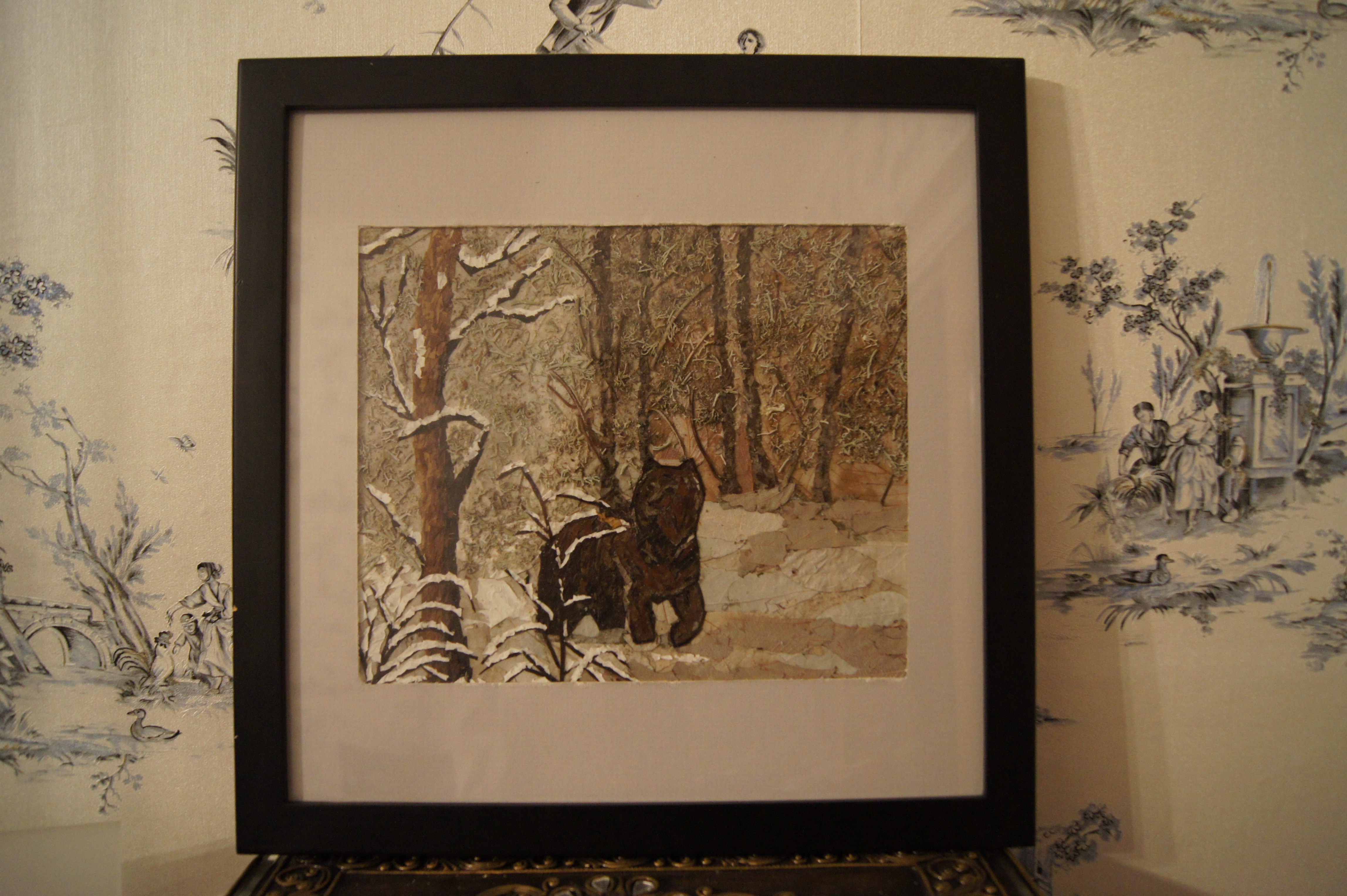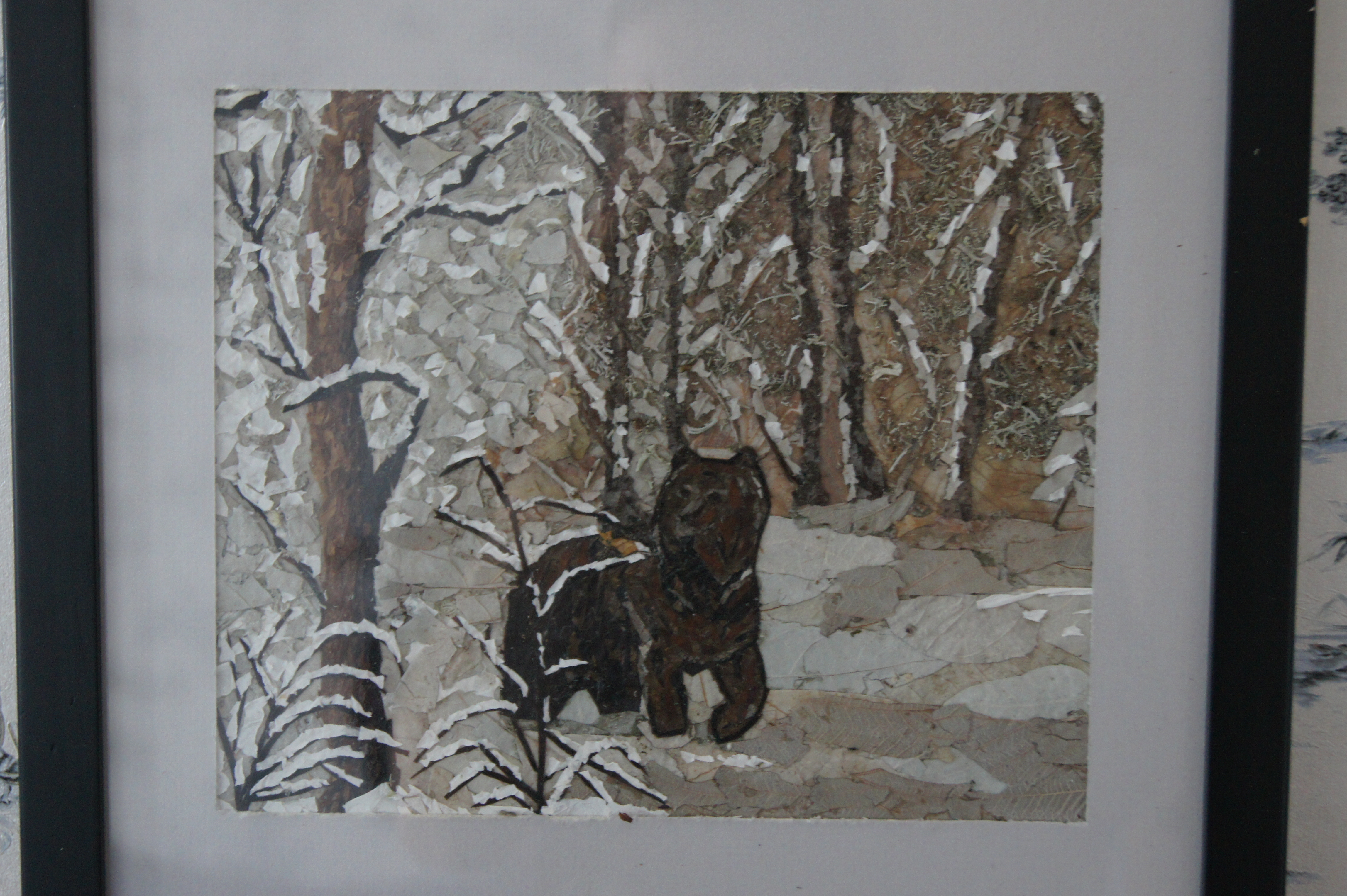 Лався, на мой взгляд работа с мишкой очень удалась в плане изображения фона и деревья замечательные!!! А у мишки уж очень уж четкие контуры, он как бы "обведен" по периметру...может добавить шерстинок и ушки округлить, тогда будет замечательно!!!Молодец!!! А по поводу выбора материала для собачки, то можно и листики малины попробовать, если есть..они такие разные по оттенку
