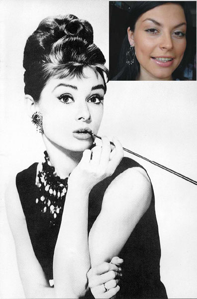 У меня за основу была взята фтография известнейшей актрисы Одри Хепберн (к/ф "Завтрак у Тиффани", например), а накладывала я обычную цветную фотографию знакомой девушки. Эта фотография была обработана так, чтобы максимально соответствовать основе.