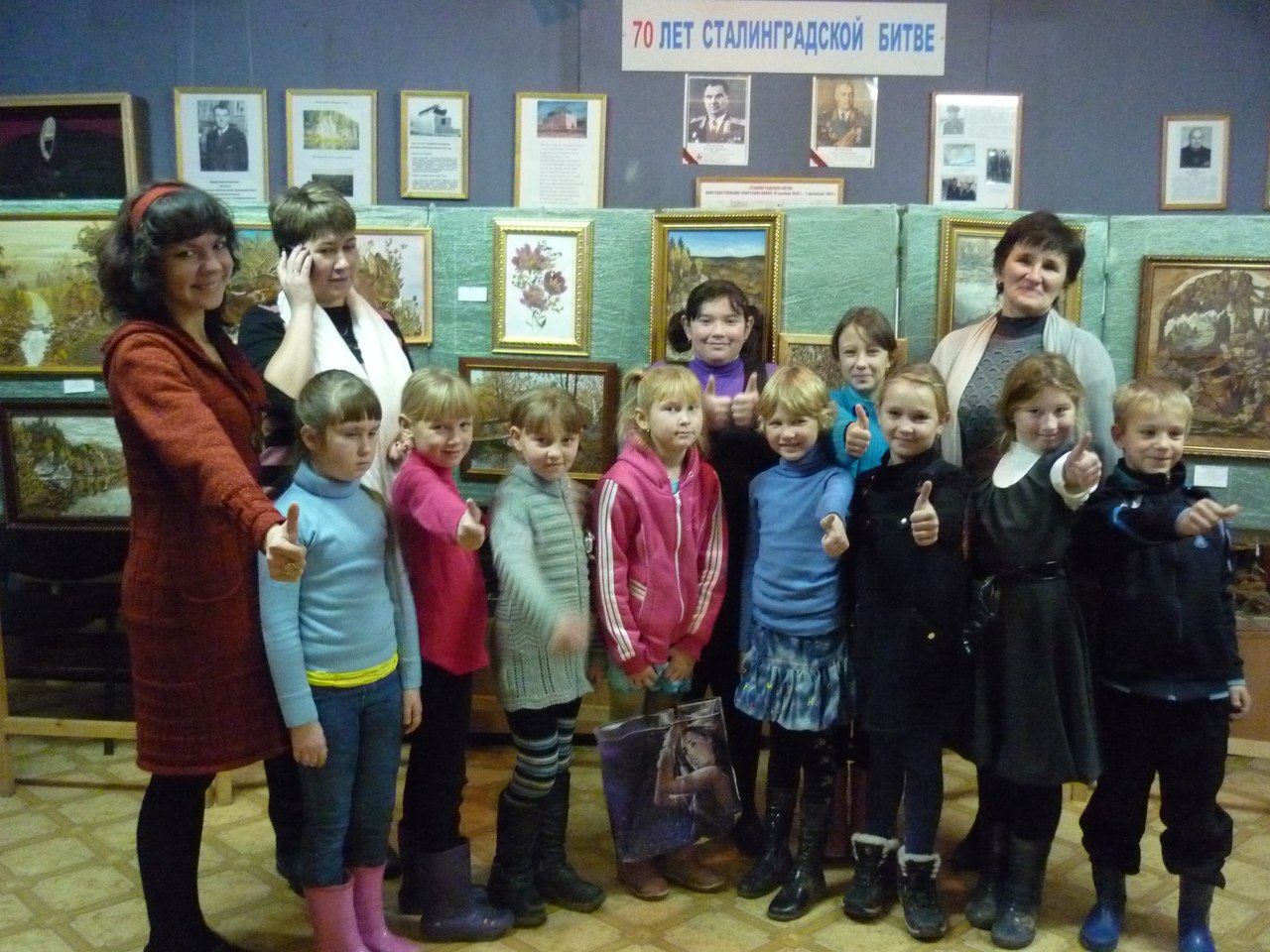 У меня тут тоже маленькая выставочка была в музее при школе, детишкам понравилось. Девочка-экскурсовод придумала интересный рассказ-путешествие по картинам: "Мы"- говорит- " то зайчика от лисички спасали, то уточек кормили ))"
