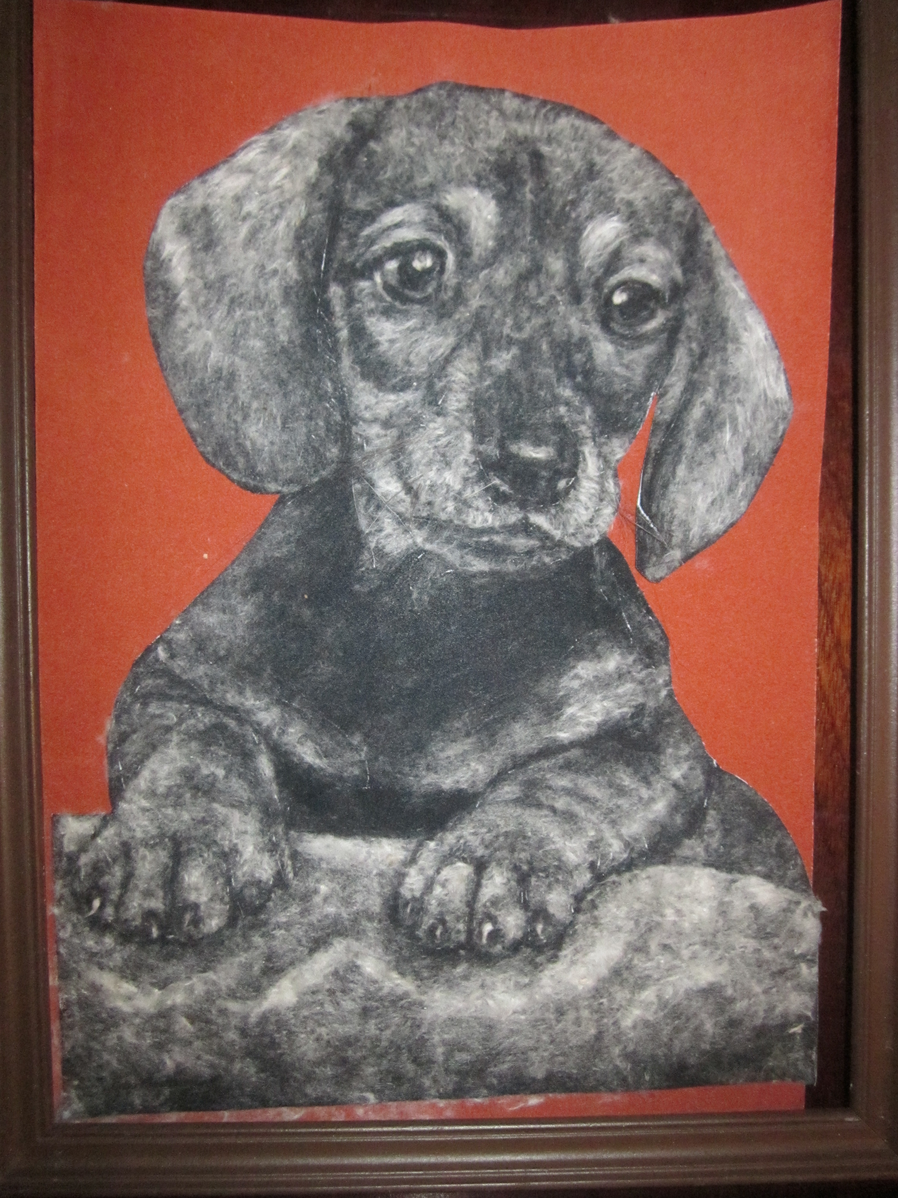 Зашла я в раздел рукоделия, но там ничего близкого не нашла. Даже из овечьей шерсти нет. А новую тему открывать не хочу. А здесь вы все мне родные. Да и техника флористики используется. Новых собачек из шерсти сделала еще зимой, только оформление никак не сделать. Но с пухом мне нравится работать больше- легче и как-то аккуратнее получаются, но только в черно-белом исполнении. Хотя мой последний эксперимент: Сам портрет делается на черной бумаге,потом вырезается и переносится на цветной тон. Хочется меньше черного цвета.