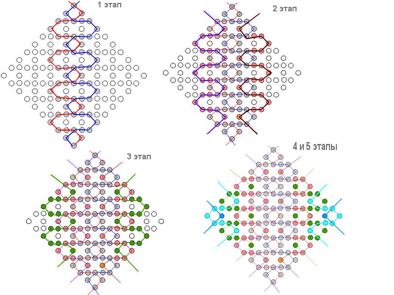 красные точки - 1-й ряд, колечко из 3-х бисерин, оранжевые точки - 2-й ряд (без прибавления), жёлтые точки - 3-й ряд, прибавление, приплетаем по две бисерины, зелёные точки - 4-й ряд, кажись без прибавления, то точно не видно, надо пробовать, потом кажись ещё ряд без прибавления, потом убавляем