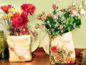 Самые простые идеи рождаются из таких же простых и обыденных вещей. Оглянитесь вокруг. На окнах висят ситцевые занавесочки, на диване – покрывало из тяжелой портьерной ткани. Подоконники украшены цветочными горшками, а посреди стола стоит красивая, но немного надоевшая ваза с цветами. Как же иногда чешутся руки что-нибудь изменить в этой милой знакомой обстановке. Можно, конечно, пойти и купить новую вазу. Но можно попробовать сделать ее самостоятельно. Не надо мучиться за гончарным кругом или в стеклодувной мастерской – оба эти занятия требуют мастерства и специальных навыков. А можно обойтись и подручными материалами. Полотняная ваза, сделанная своими руками, будет прекрасно гармонировать с вашей дачной обстановкой, сочетаясь с занавесками, покрывалами и всеми остальными деталями интерьера. Материалы, которые вам понадобятся для этого изделия, можно собрать, не выходя из дома. Благо кусок ненужной драпировки, ситца, льна или любой другой ткани, а также картонная коробка, обычная стеклянная банка и канцелярские мелочи всегда под рукой.
