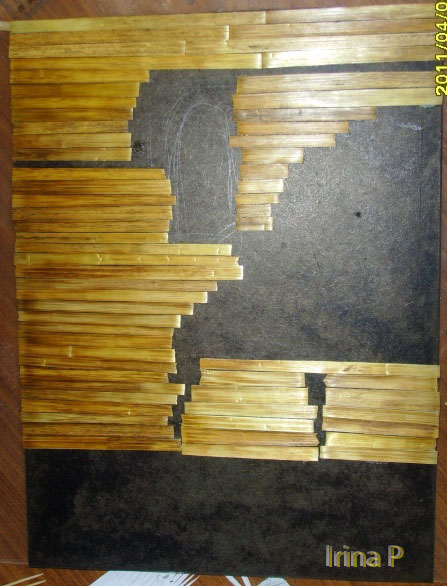 наклеиваем по предварительным контурам соломенные ленты, так, чтобы немного заходили эти ленты под будущие фигуры
