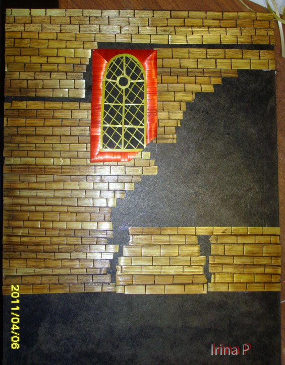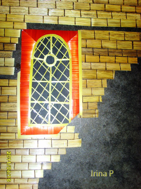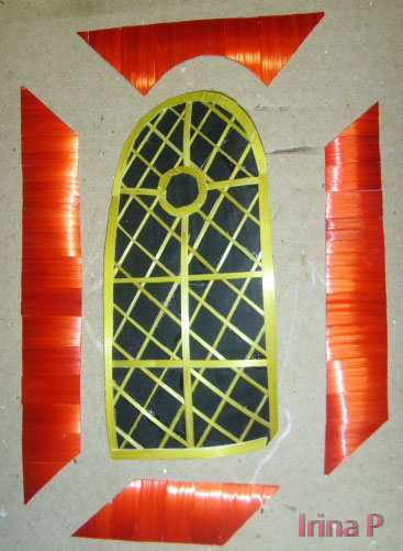 следом сразу на фоне делаем "карниз"-там, где осталлся черный фон (широкие полосы) у окна карниз идет зиг-загом, предполагаю два цвета: желтый и красный.Т.е. желтый будет выглядывать из-под красного, этим отделим наше окно от карниза и придадим большее выделение элементам стены.(итог покажу на фото).