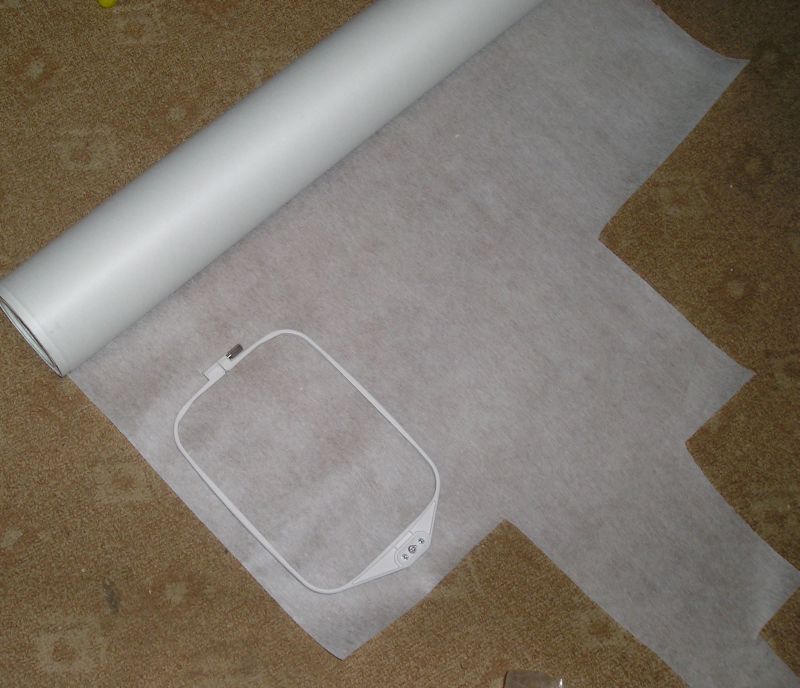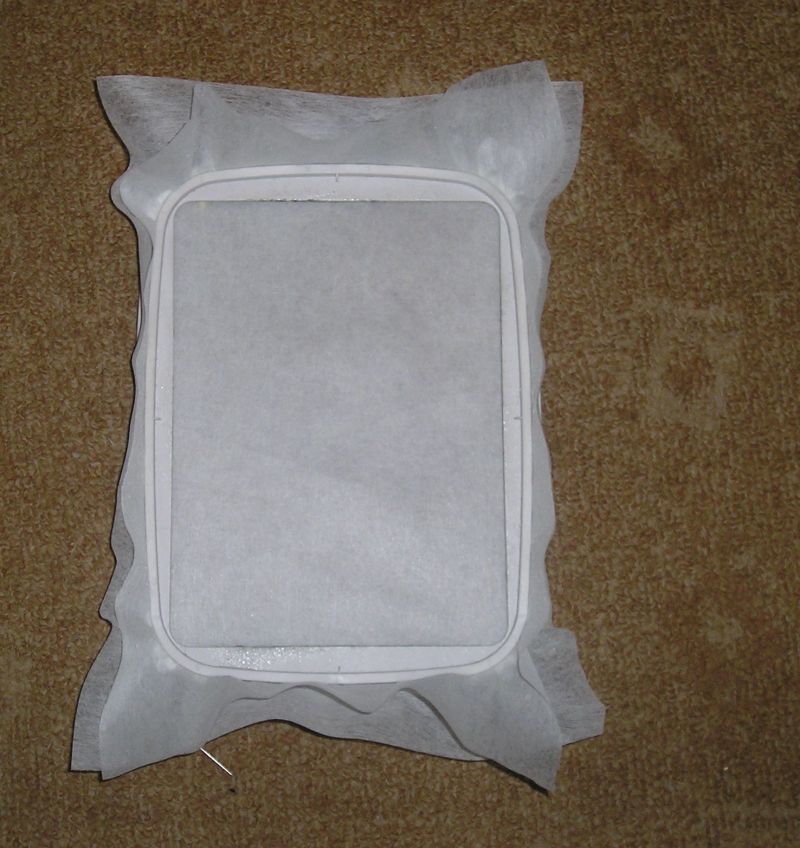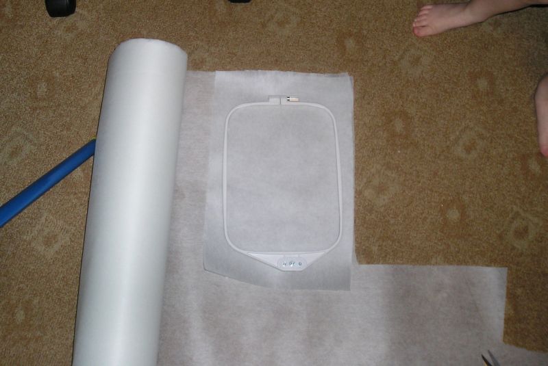 Первым делом выбрали дизайн (я его сделала сама) и загрузили в машинку. Аппликацию буду делала на моем бывшем свитере ручной вязки из ниток "букле". Надо отрезать стабилизатор, как я уже писала, я стабилизирую отрывным стабилизатором в два слоя под 90 градусов расположенные. Запяливаем стабилизатор.