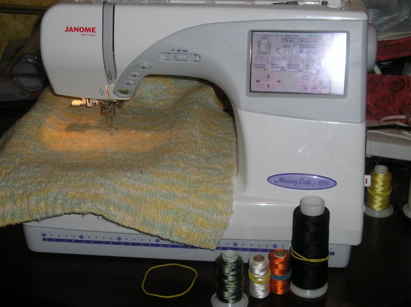 Дальше ставим следующий цвет (белый, будут вышиватся глаза). Эти нитки у меня другой фирмы, и именно они, чаще всего слетают с катушки сразу по много витков, из-за этого они путаются и рвутся, хотя сами по себе нитки не плохие индийские и почти единственные, что продавались у нас (больше их возить не будут), и я их ставлю в машинку в сеточке сложенной пополам (прилагалась к оверлоку). Дальше запускаем и отдыхаем (не забываем менять цвета).