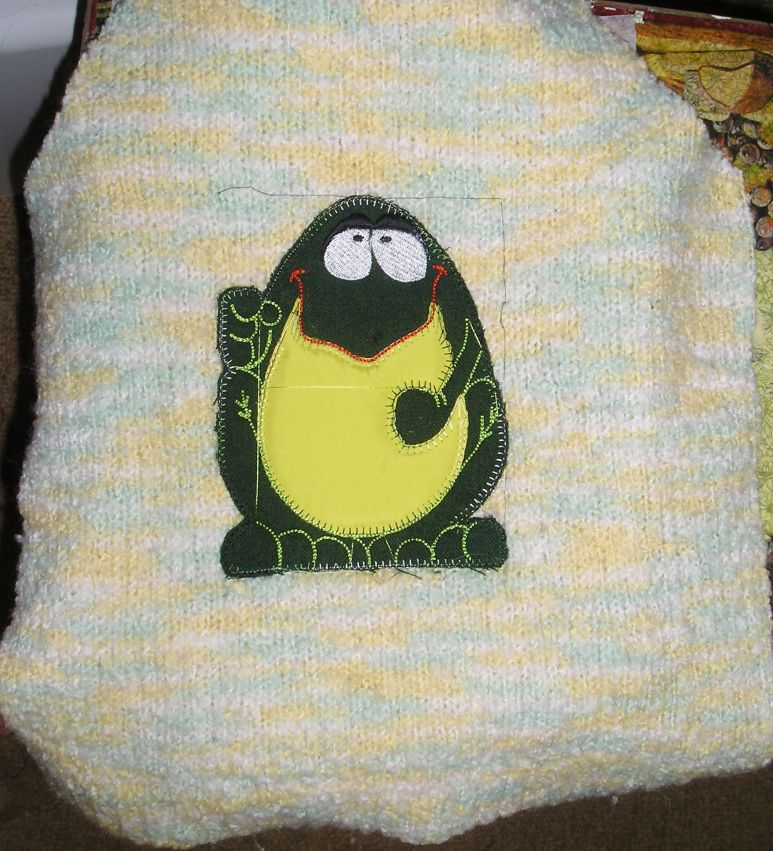Запускаю машинку. Первым делом она отшивает рамочку по контуру дизайна (которую я задала в Эмберде) для стабилизации. Потом обшивает первый "пробег" аппликации и останавливается. Снимаем пяльца (ткань не вынимаем естественно!!!). И на это место клеим (тем же самым клеем, я брызгала осторожно то, что в пяльцах стараясь не переборщить, чтобы наверх не выступал клей) зеленую ткань - туловище будущей лягушки, клеим примерно, тряпочку вырезаем просто прямоугольником.