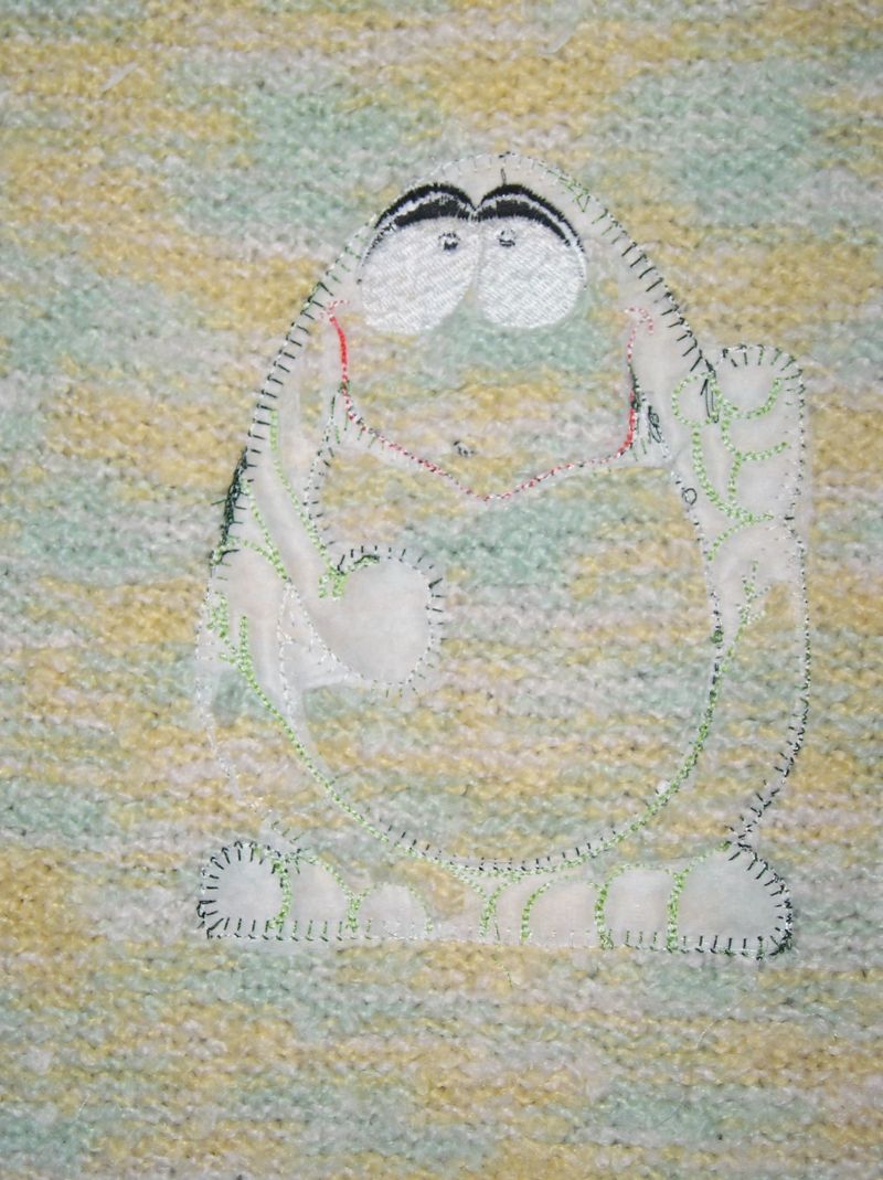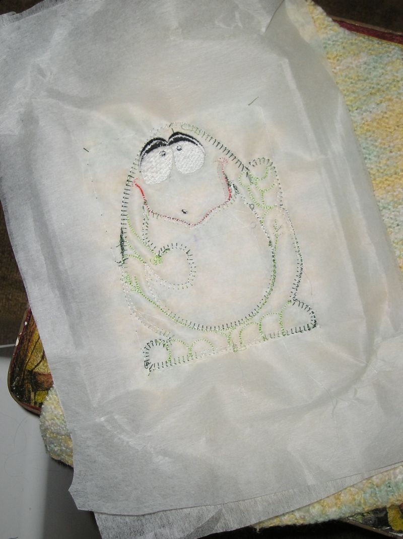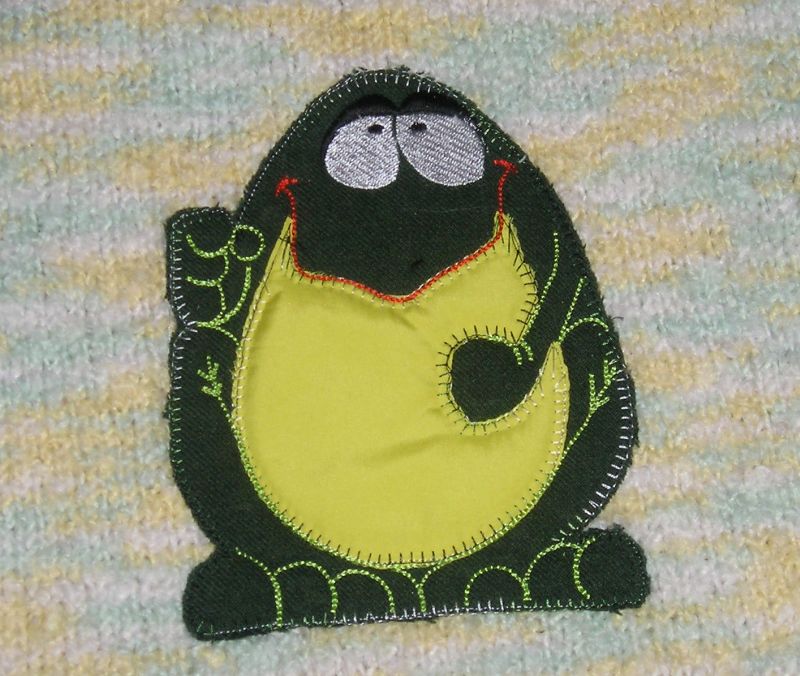 Дальше машинка еще раз пробегает по туловищу лягушки и опять останавливается. Достаем пяльца из машины (ткань остается в пяльца, делаем это осторожно, чтобы наша вышивка из пялец не выскочила). И аккуратненько обрезаем по контуру маникюрными ножничками. Снова вставляем пяльца в машинку, запускаем дальше, машинка обстрачивает край аппликации декоративной строчкой (в моем случае Е-стежок, может быть и валик сатина), и обстрачивает пузо лягушки.
