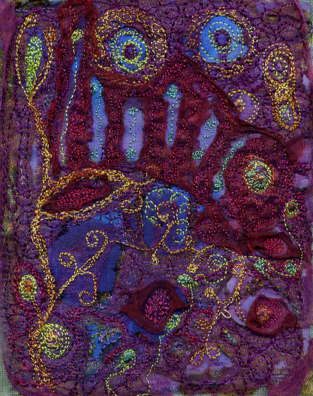 Coloured silk yarn on blue satin silk (reversible)