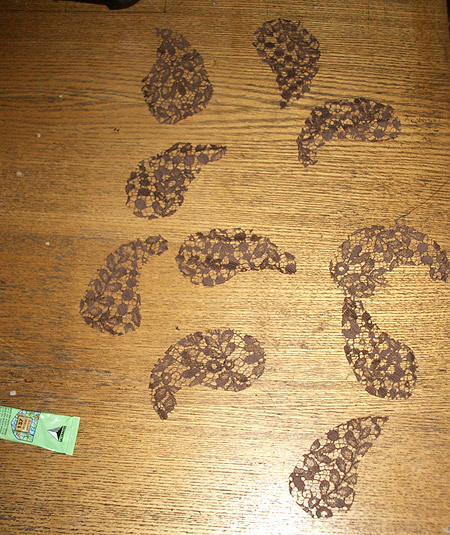 И ещё один способ декора. Значит, так - таким способом можно декорировать что угодно - кукол, чемоданы, мебель, открытки, стены. Берём гипюр - это такая кружевная ткань. Вырезаем из неё любые формы - если на ткани есть красивый рисунок, можно вырезать по