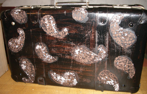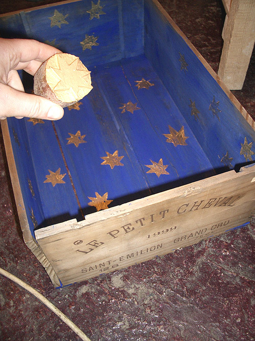 Итак, вот что можно сделать из любого предмета, а именно здесь - из найденного на помойке винного ящика, при помощи акриловых красок и обыкновенной картофелины, которая является прекрасным материалом для изготовления простых штампиков для декора (стен, открыток, тканей, да и чего угодно).