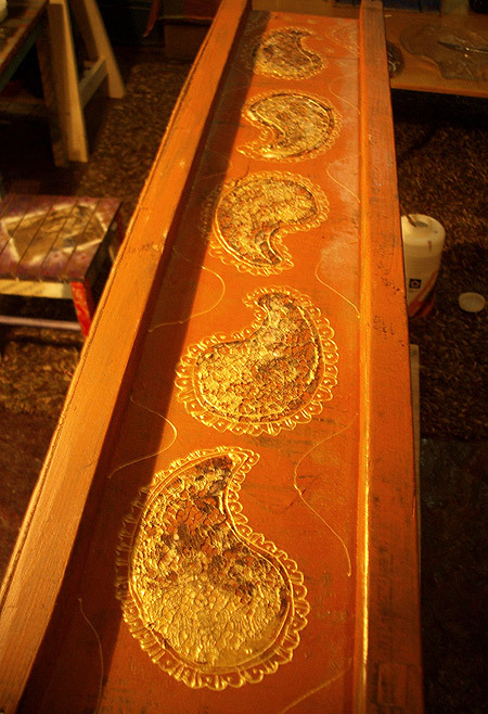 Затем затираем кружево акрилом, белым или золотым или любым, а потом уже рисуем ему какие-то границы - можно этого не делать, смотря какой замысел, а можно делать это "контуром", то есть объёмными красками, которые продаются в любом магазине для художников - тогда не так будет бросаться в глаза переход между рельефом и плоскостью.