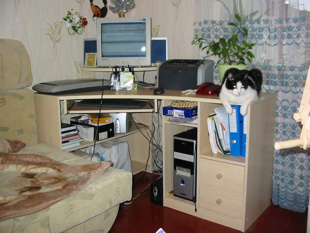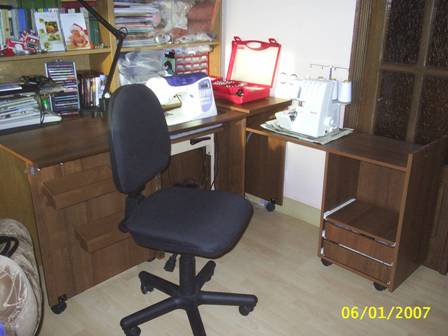 А как у подруги с местом? Я вот после переезда вынуждена была решать задачу так сказать кардинально. У меня рабочий стол один, компьютерный угловой, но длинный. В углу компьютер, рядом сканер и принтер по бокам, еще остается место для швейной машинки и оверлока. Все это хранится на нижней полке стола. Очень удобно и все удовольствие стоит 3100, намного дешевле, чем специализированные. Два ящичка, полочки. Единственное, кроить негде, но все сразу не бывает. Кроить пока либо на полу, либо к маме в комнату на стол книжку. Если получится,попробую на дисках посмотреть, остались ли у меня фото, должны были по идее.