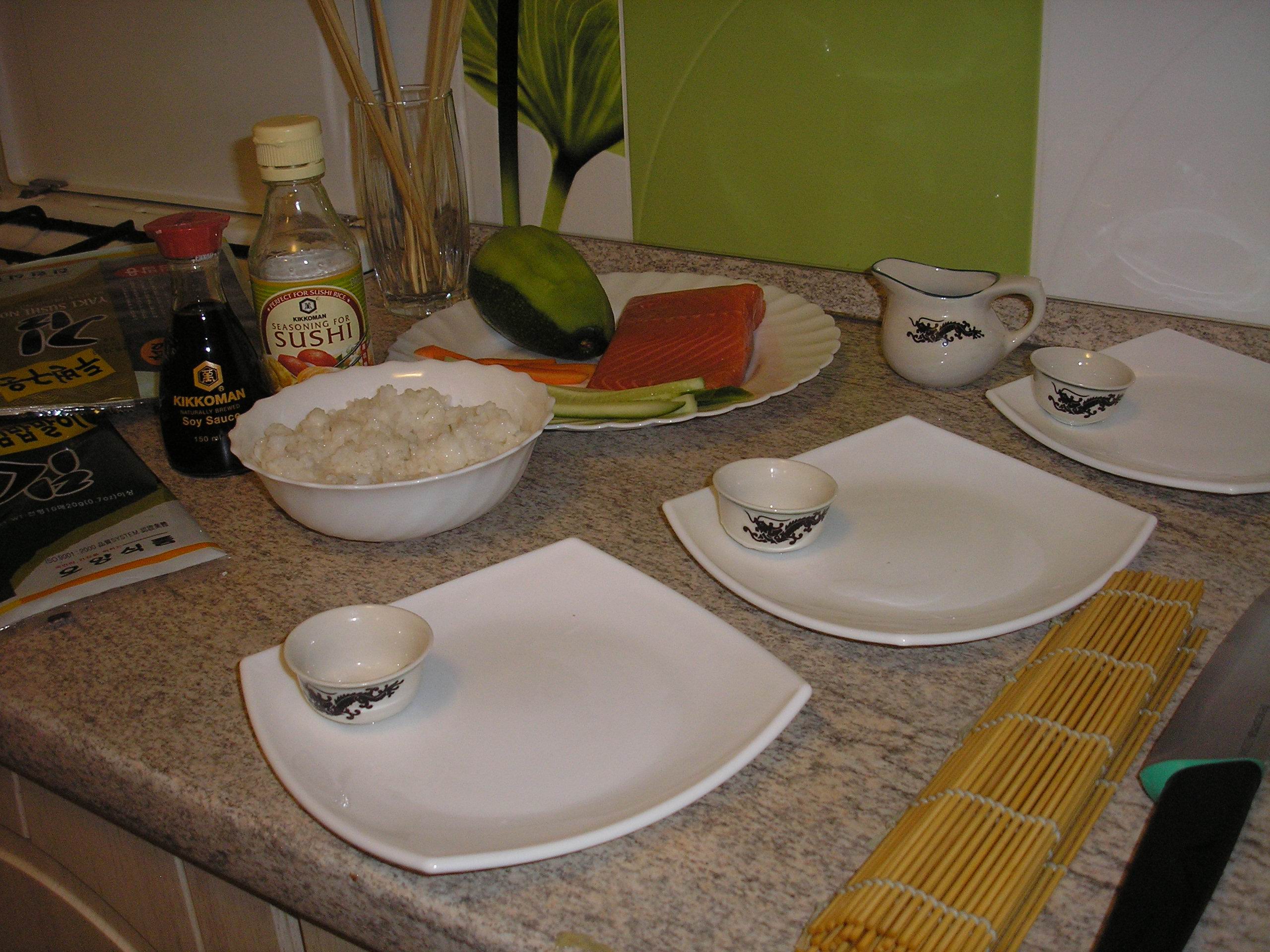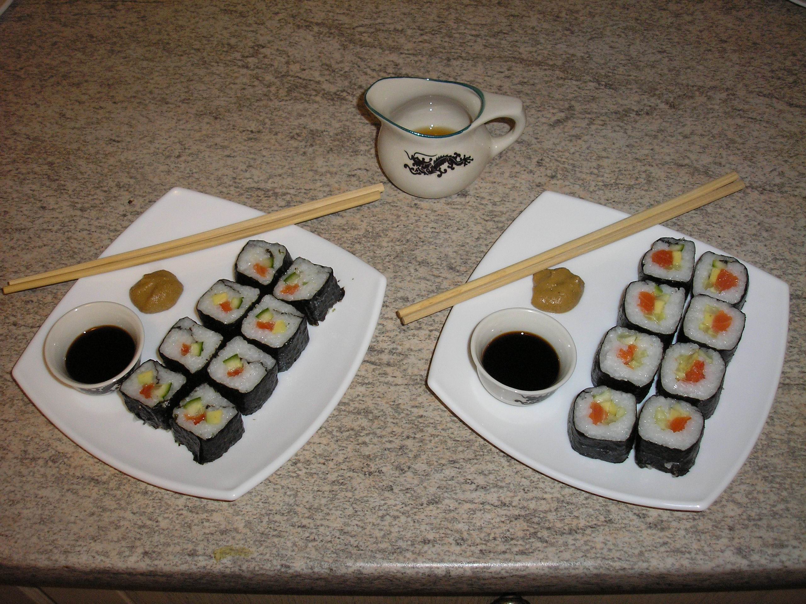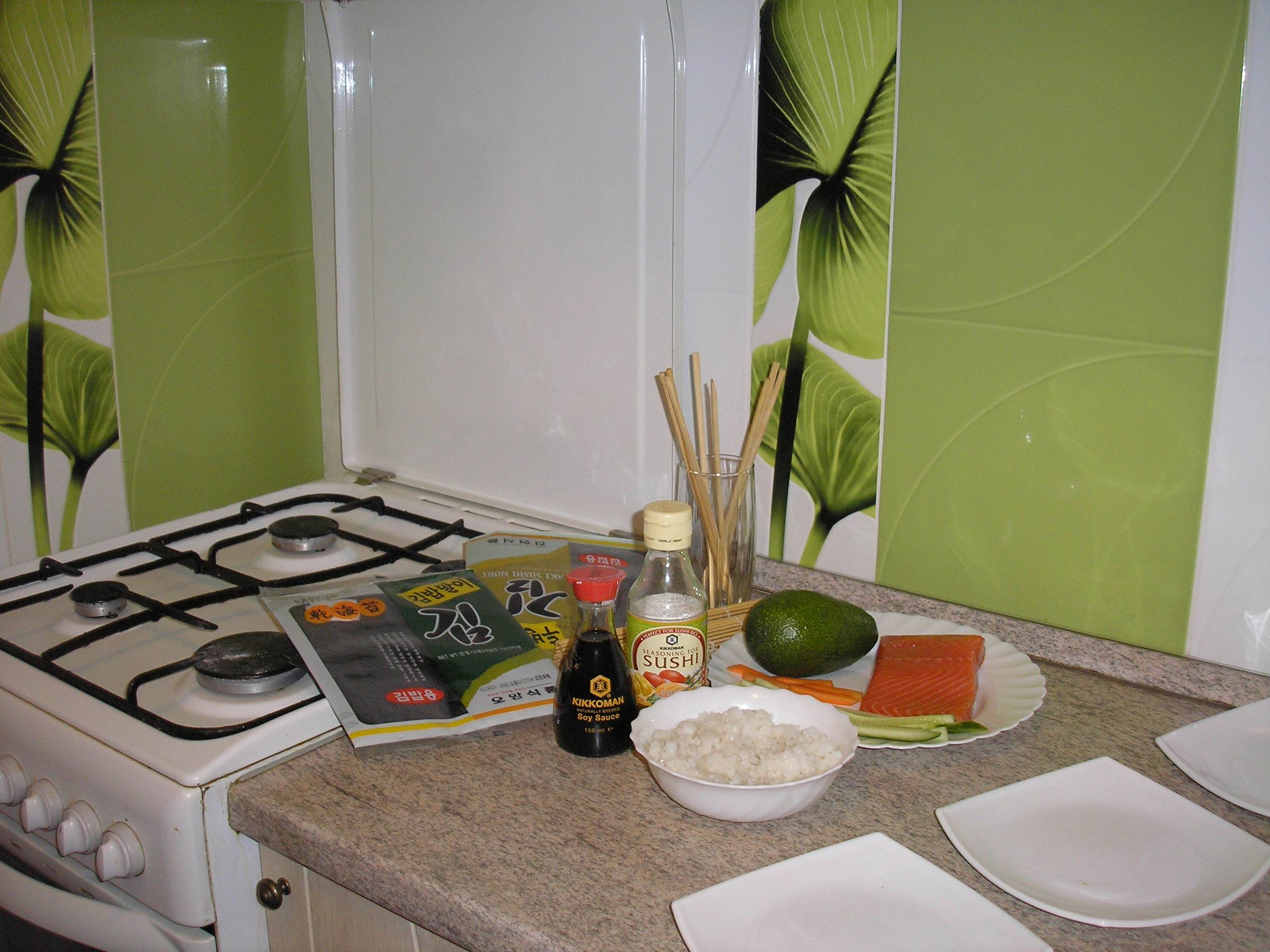 Были листы водорослей. и соус киккоман. И бамбуковый коврик, для работы и палочки. естесстна.